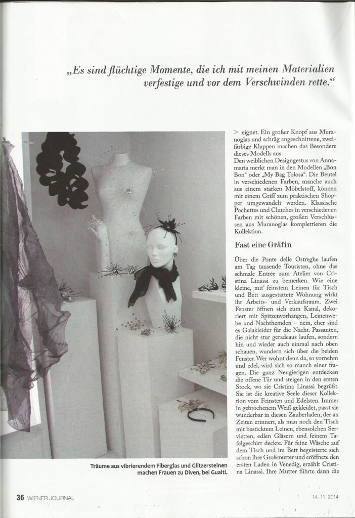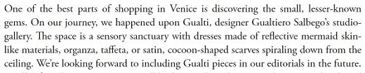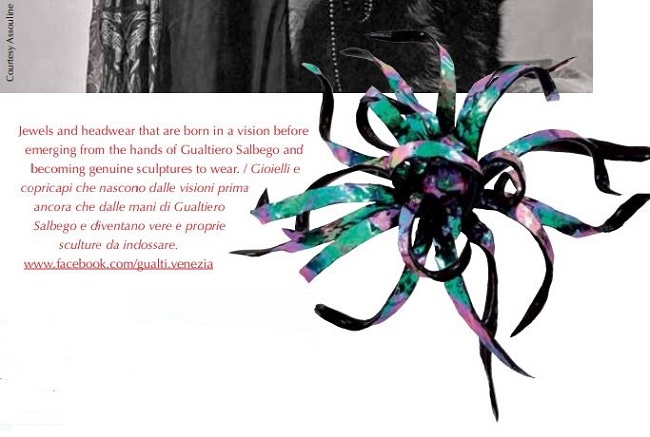 Al entrar en el minúsculo atelier en Venecia del maestro Gualti, veneradoy por las divas de la ópera, damas de la jet-set internacional y las “celebrities”, me siento un poco como “Alicia en el País de las Maravillas”, en una película antigua de David Linch, a la espera de que se abra el telón…Sin embargo ocurre todo lo contrario…Me sumerjo y floto en el cálido, transparente y gelatinoso liquido de un lírico y onírico universo paralelo, y allí en aquel pulcro y perfumado lugar de fantasía, me saludan con la fuerza de la ternura criaturas transparentes, multicolores, subterráneas y diáfanas inspiradas en la naturaleza… Veo formas caleidoscópicas y oigo el lenguaje del mundo vegetal sintiendo la inexorable e infinita fuerza poética de la naturaleza. Incluso llego a intuir el alma invisible de los objetos…