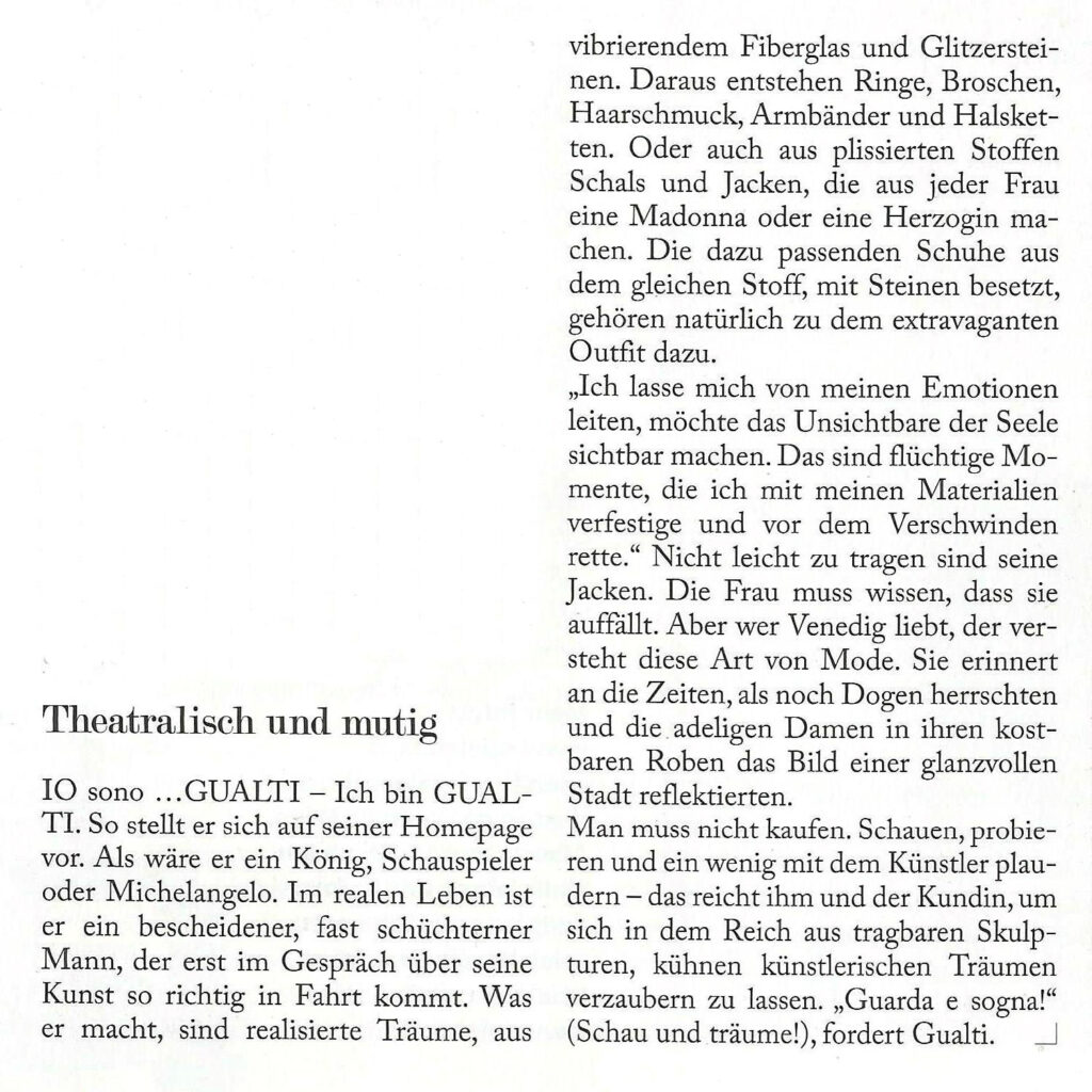 Cuesta creer que el hombre simpático, inteligente y seguro de sí mismo fuese un niño tan introvertido. Gualti habla con la propiedad de los grandes oradores y maestros. Durante su infancia se sentía frustrado viviendo en un pueblo campestre a apenas 50 kilómetros de distancia de Venecia, encontrándose con la prohibición de sus progenitores de proseguir sus estudios en una escuela de arte y desarrollar sus talentos artísticos, ya que los mismos querían que trabajase en una fábrica. El recorrido profesional de Gualti fue un camino de espinas, hasta que vivió un encuentro mágico con un ángel en forma de mujer sofisticada y de mundo, que le empujó a abrir su propio espacio de trabajo…y desde el primer día de lo ocurrido pudo saborear las mieles del éxito en Venecia (ciudad de criaturas misteriosas, que habitan las aguas y los alrededores de la laguna). Ha diseñado espectaculares joyas escénicas para la gran diva de la opera Liesl Odenweller y adornó con sus esculturas al gran mito de la canción italiana Ornella Vanoni.El maestro tiene una relación de pareja desde hace más de dieciocho años que le aporta gran serenidad. La música es otra de las compañeras inseparables del artista, que le sirve de ayuda durante su proceso creativo. Le gustan: Rudy Adrian, Bruno Sanfilippo, Harold Budd, David Sylvian y adora el espectáculo “Sun Flower Moon” de los Momix.