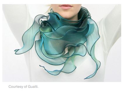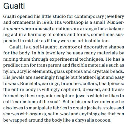 Las creaciones de Gualti son minúsculas y ligeras como las alas de un escarabajo y pueden llegar a ser grandes y compactas como los pectorales de bustos egipcios. El corazón de las joyas tallos de luz es de cristal y sus latidos son como gotas de aguas emitiendo filamentos incandescentes…Las chaquetas asimétricas con mangas de murciélago se ajustan a la silueta perfectamente, convirtiéndose en vibrantes extensiones corporales llenas de vida propia, que son el resultado de las emociones del artista. Los prendederos se apoyan sobre la espalda como capullos medio abiertos. Los gorjales se cierran alrededor del cuello como húmedas corolas de flor bañadas por el rocío…Las micro y macro esculturas decoran el cuerpo femenino de forma clásica y minimalista. Las piedras preciosas toacio, ametista y safiro se revalorizan y materializan en forma de objeto joya y bisutería fina, uniendo el clasicismo con la modernidad.