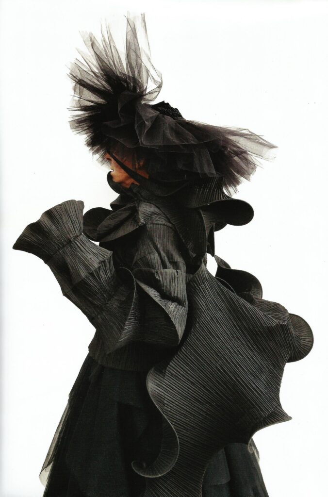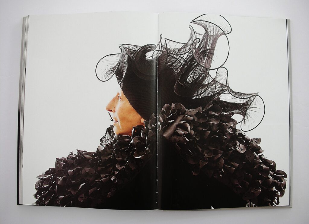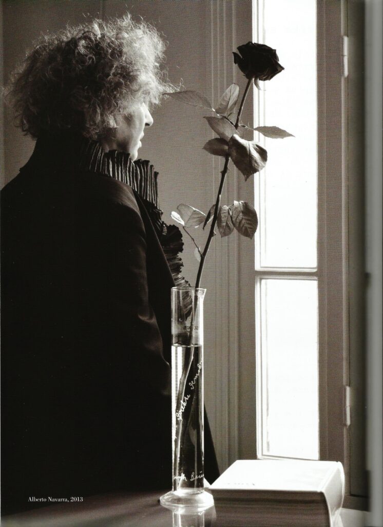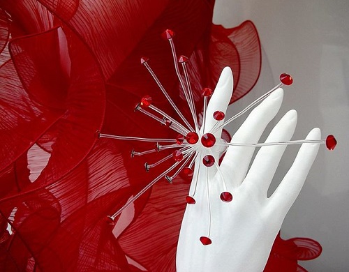 Yo mientras tanto contemplo con asombro esculturas tridimensionales para engalanar el cuerpo, anillos receptores de luz, anillos violeta, broches con resplandor lunar, pulseras florales, sinuosos y plisados echarpes, chaquetas ondulantes, chaquetas mariposa, vaporosas bufandas de organza, anillos y prendedores flor de cactus, broches anémona de mar sin veneno, deliciosas gargantillas de bayas rojas, collares asimétricos y pistiliformes como cuchillos, pulseras sintéticas en forma de hoja pintadas a mano, esculturas a modo de chal, gargantillas lluvia de luz, broches flores del mar, iridiscentes anillos como nubes, anillos espejo años sesenta, anillos cinéticos llenos de movimiento, gargantillas huevos de rana, tocados florales para novias, bufandas con ingeniosas formas en espiral, bufandas medusa, raíces-escultura emergiendo desde lo más profundo…
