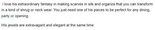Una pieza de Gualti revaloriza cualquier prenda, porque aunque tus zapatos y vestido tengan muchos años y poco valor económico, dejándote analizar por el mago Gualti, él encontrara una criatura, que esté en perfecta sintonía con tu alma. Llevar una creación suya es casi como llevar un amuleto mágico, que nos ayuda a abrir las puertas de la alta sociedad y hacernos sentir bellas, especiales e únicas….Por muy fea que se sienta una mujer, con una escultura de Gualti se verá transformada por arte de magia en una mujer bella.