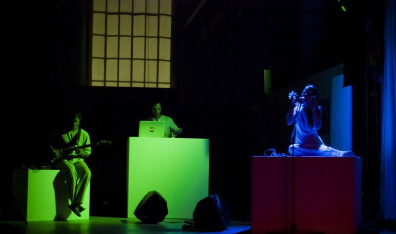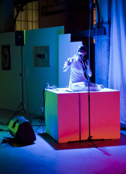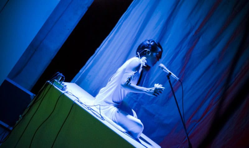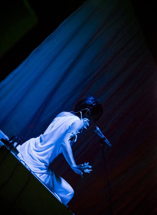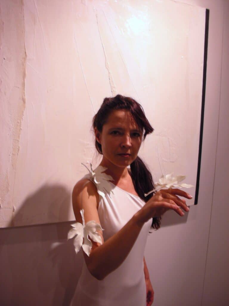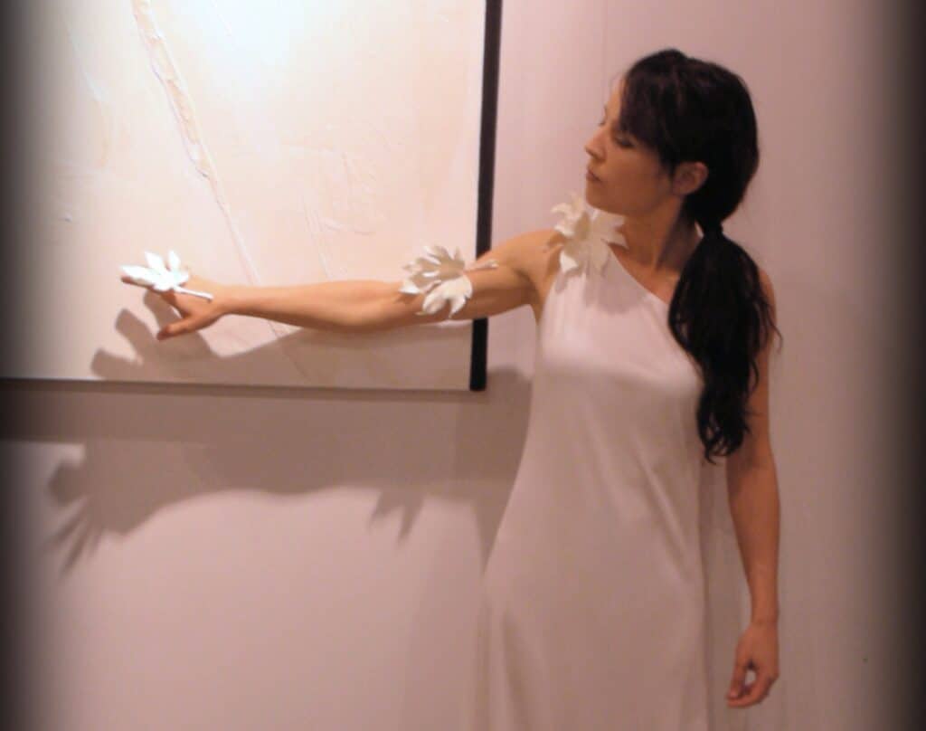 Concerto / Performance ” Macello, the end “ di Romina Salvadori Realizzati appositamente per l’evento : abito in seta bianca asimmetrico, spilla, bracciale e anello “Aralia” in resina sintetica bianca di GUALTI