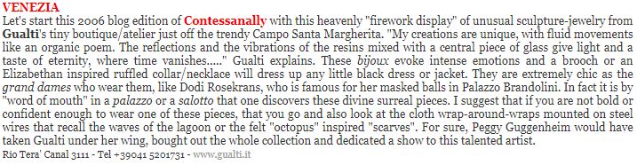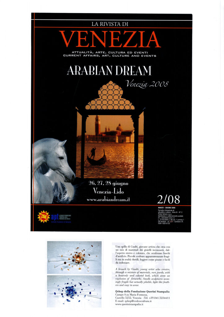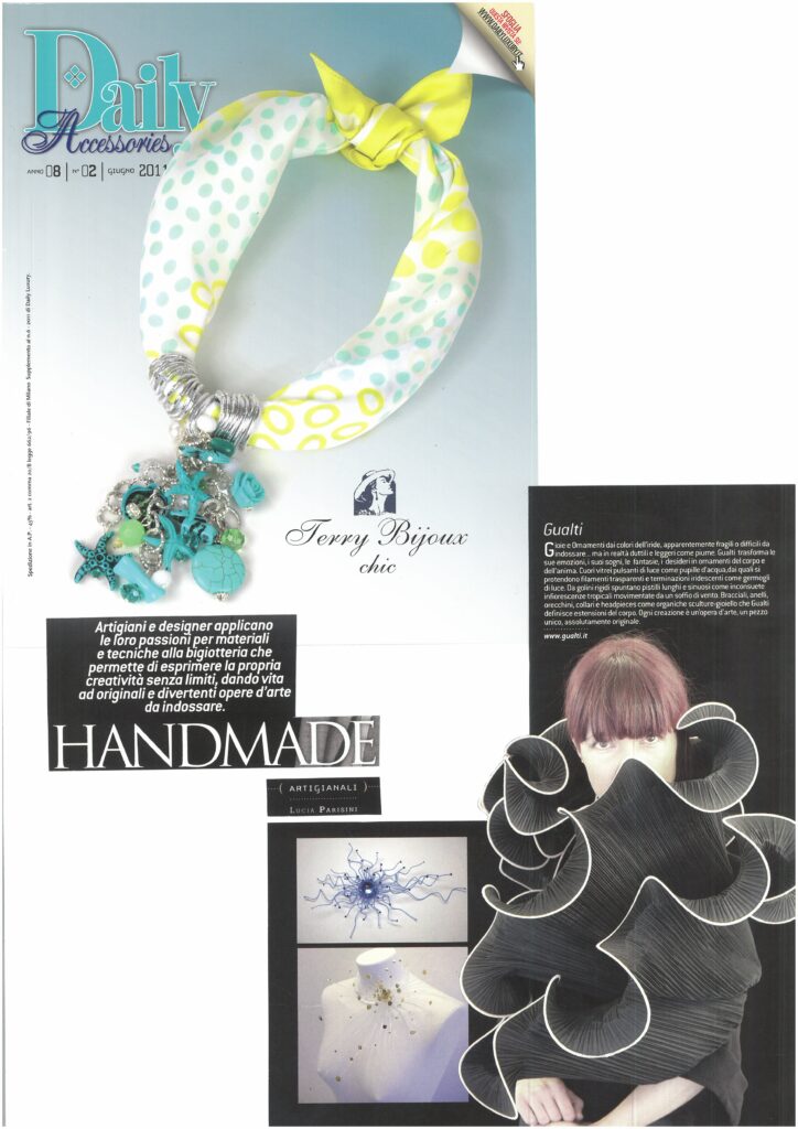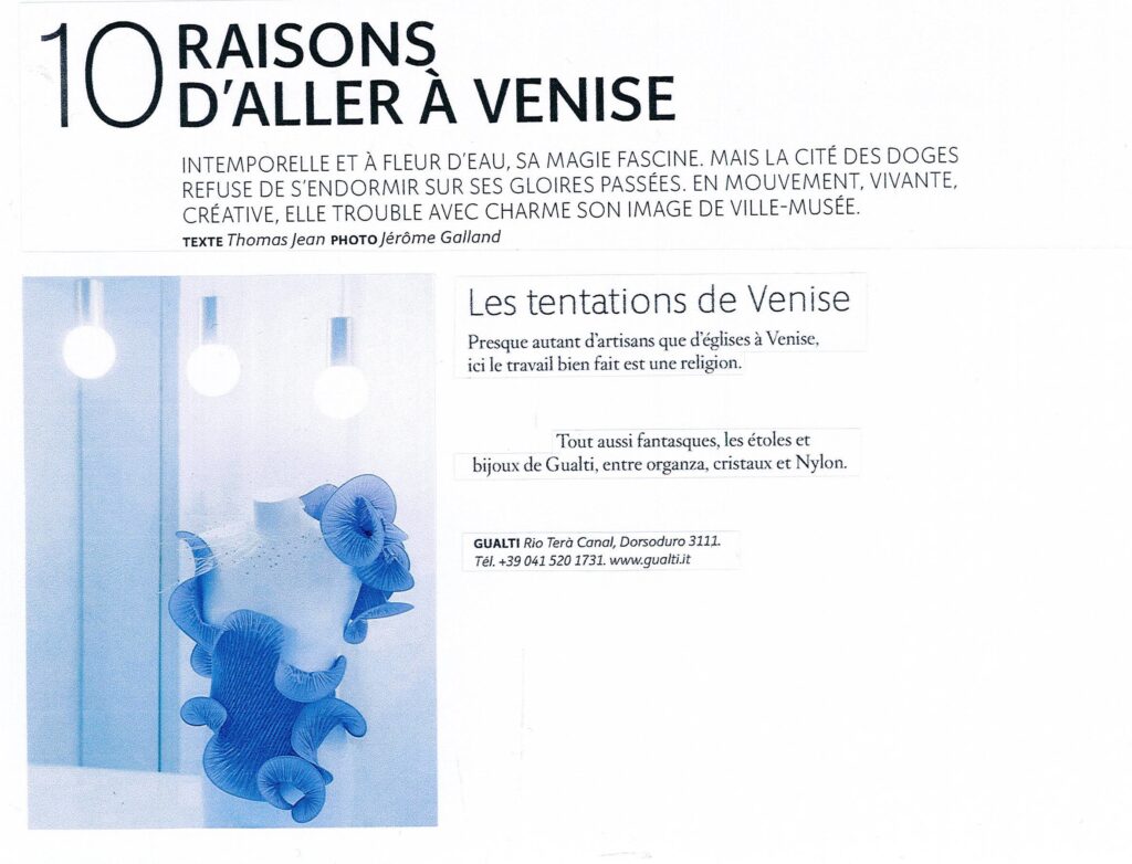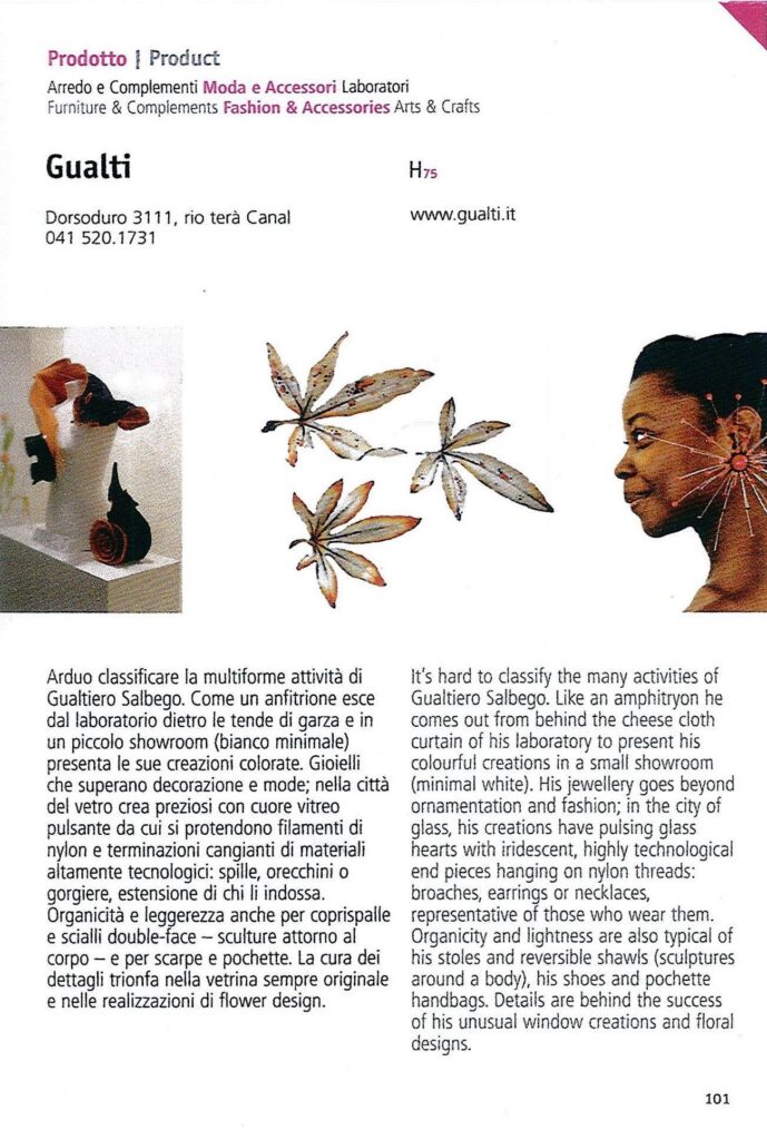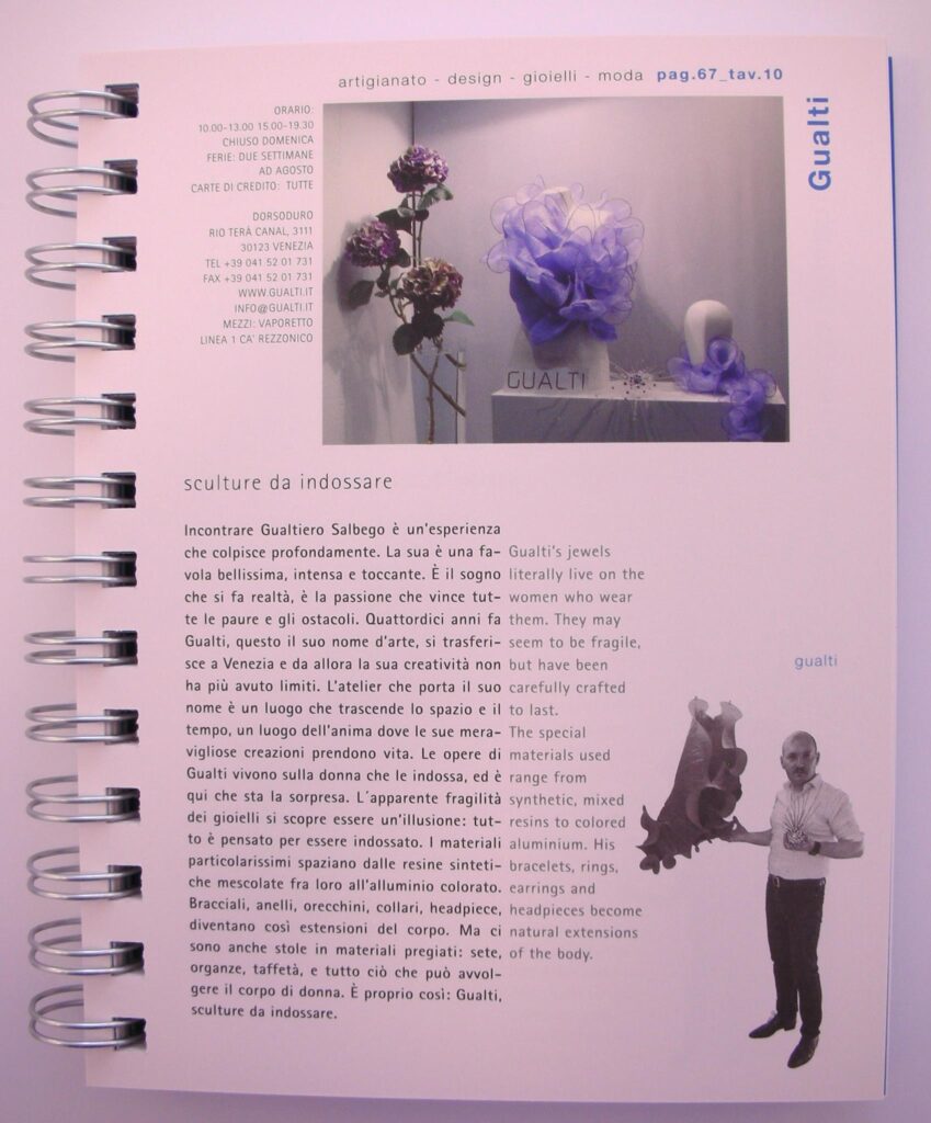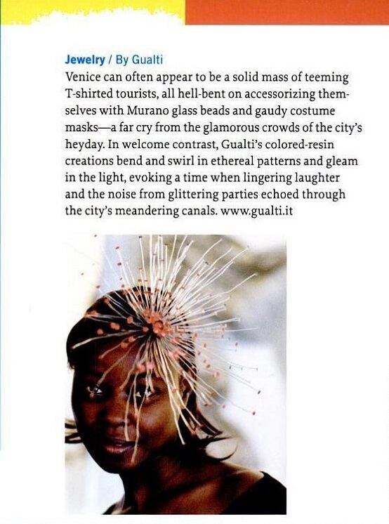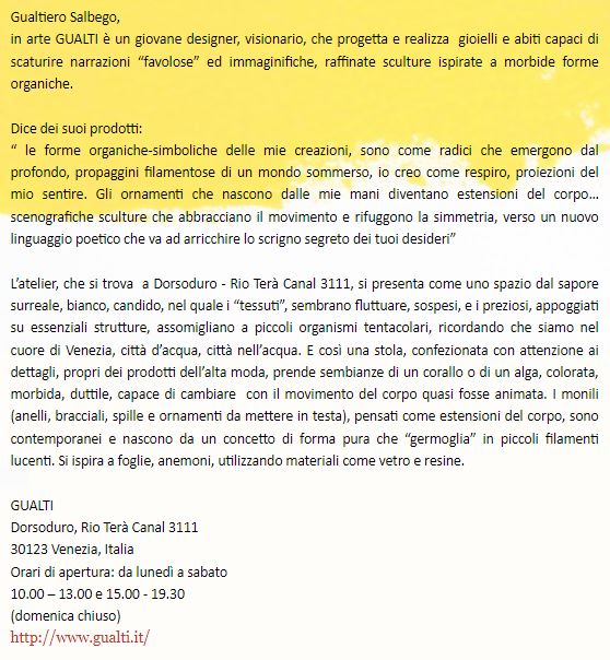 Artigianato, Design, Gioielli, Moda Gualti sculture da indossare Incontrare Gualtiero Salbego è un’esperienza che colpisce profondamente. La sua è una favola bellissima, intensa e toccante. È il sogno che si fa realtà, è la passione che vince tutte le paure e gli ostacoli. Quattordici anni fa Gualti, questo il suo nome d’arte, si trasferisce a Venezia e da allora la sua creatività non ha più avuto limiti. L’atelier che porta il suo nome è un luogo che trascende lo spazio e il tempo, un luogo dell’anima dove le sue meravigliose creazioni prendono vita. Le opere di Gualti vivono sulla donna che le indossa, ed è qui che sta la sorpresa. L´apparente fragilità dei gioielli si scopre essere un’illusione: tutto è pensato per essere indossato. I materiali particolarissimi spaziano dalle resine sintetiche mescolate fra loro all’alluminio colorato. Bracciali, anelli, orecchini, collari, headpiece, diventano così estensioni del corpo. Ma ci sono anche stole in materiali pregiati: sete, organze, taffetà, e tutto ciò che può avvolgere il corpo di donna. È proprio così: Gualti, sculture da indossare.