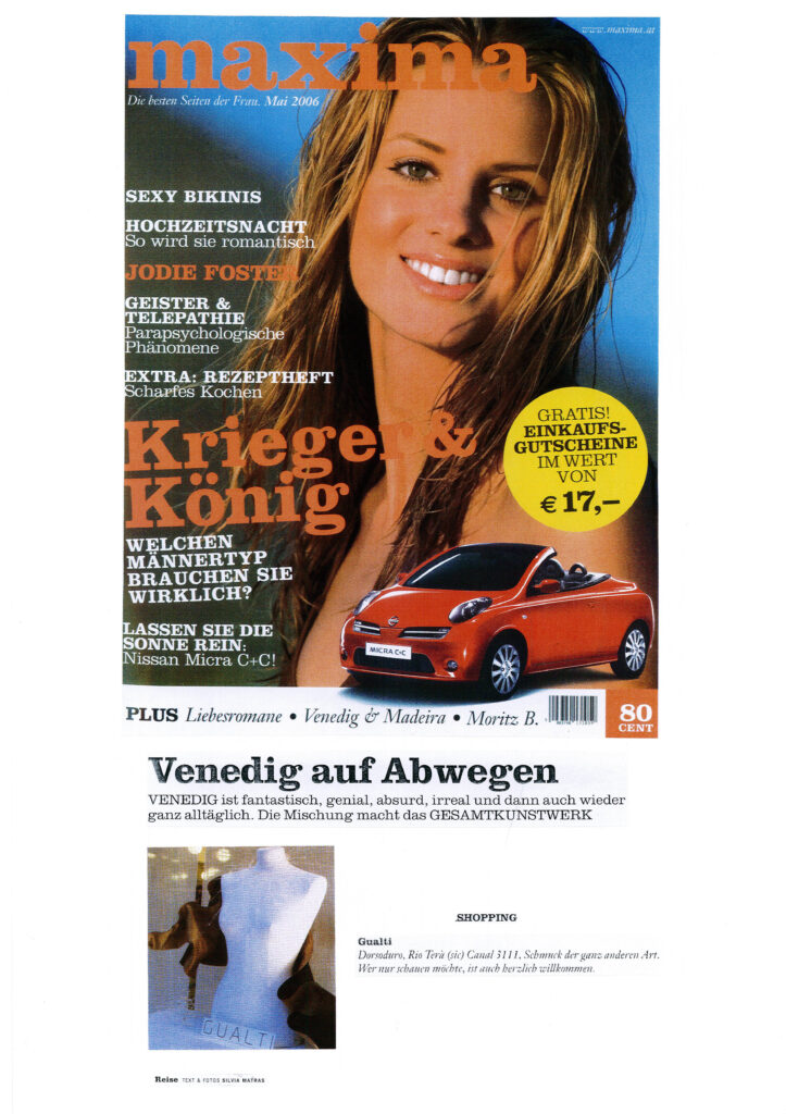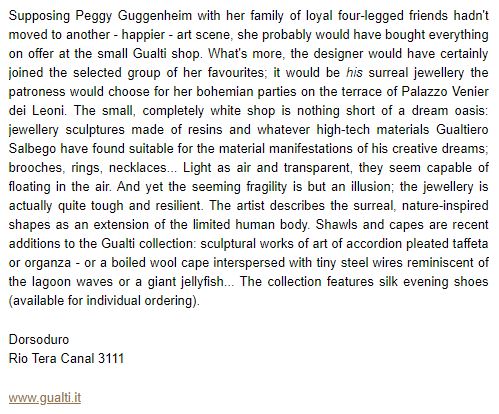 Venedig auf Abwegen VENEDIG ist fantastisch, genial, absurd, irreal und dann auch wieder ganz alltäglich. Die Mischung macht das GESAMTKUNSTWERK SHOPPING Gualti Dorsoduro, Rio Terà (sic) Canal 3111, Schmuck der ganz anderen Art. Wer nur schauen möchte, ist auch herzlich willkommen.