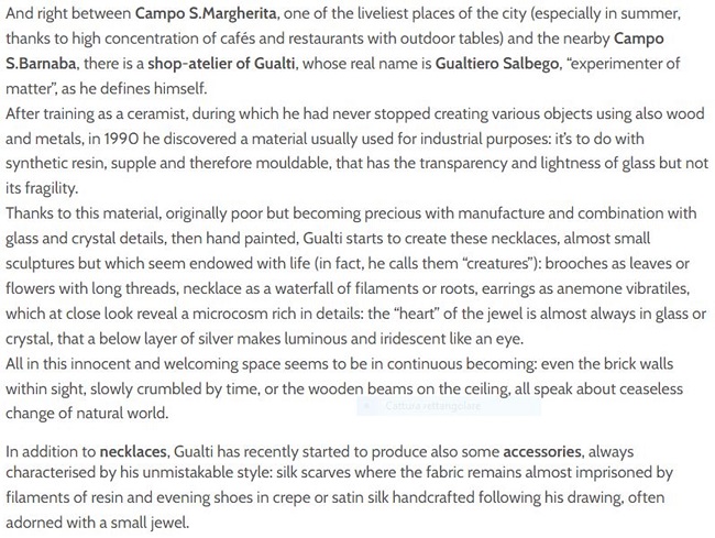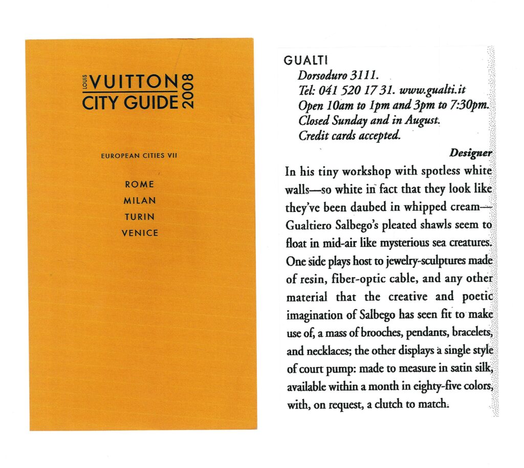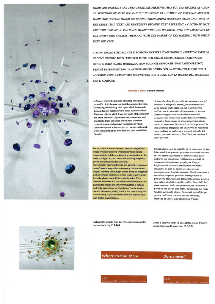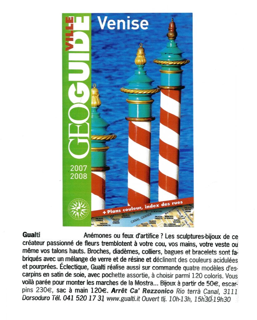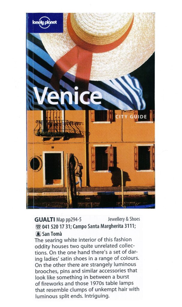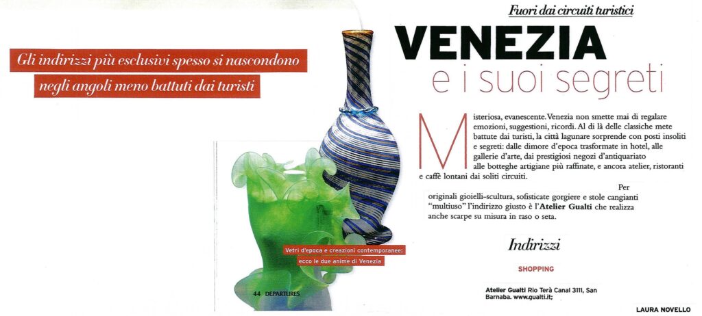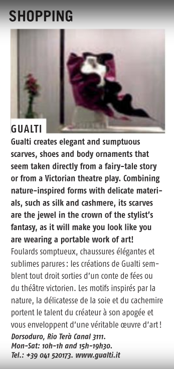 Gli indirizzi più esclusivi spesso si nascondono negli angoli meno battuti dai turisti Fuori dai circuiti turistici VENEZIA e i suoi segreti Misteriosa, evanescente. Venezia non smette mai di regalare emozioni, suggestioni, ricordi. Al di là delle classiche mete battute dai turisti, la città lagunare sorprende con posti insoliti e segreti: dalle dimore d’epoca trasformate in hotel, alle gallerie d’arte, dai prestigiosi negozi d’antiquariato alle botteghe artigiane più raffinate, e ancora atelier, ristoranti e caffè lontani dai soliti circuiti. Per originali gioielli-scultura, sofisticate gorgiere e stole cangianti “multiuso” l’indirizzo giusto è l’Atelier Gualti che realizza anche scarpe su misura in raso o seta.
