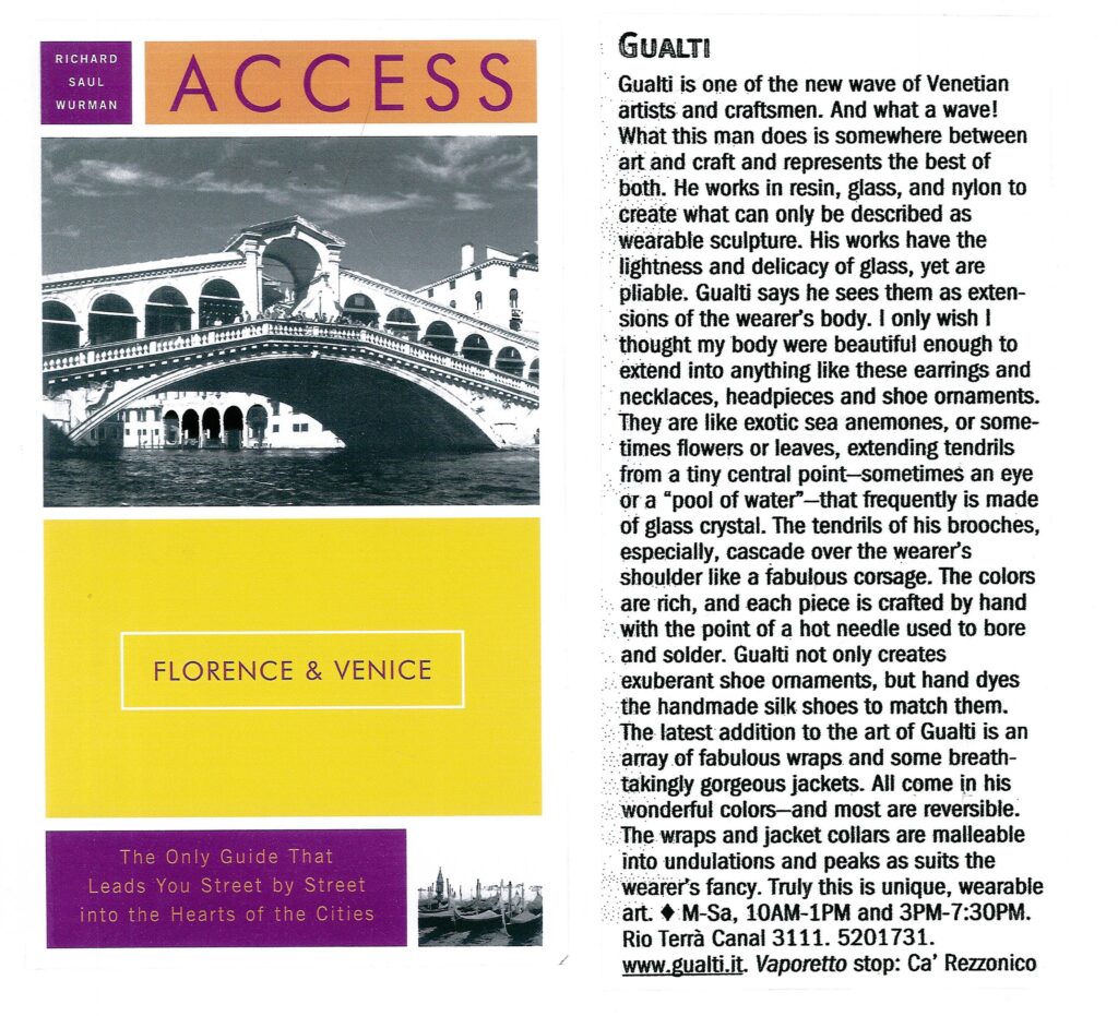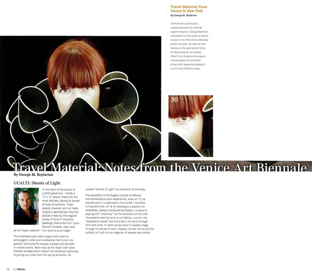 GUALTI: Shoots of Light In the heart of Dorsoduro is a white jewel box – hardly a 12′ x 12′ space, filled with the most delicate, attractive jewels of body ornaments. These jewels, however, are not made of gold or gemstones; they are actually made by the magical hands of GUALTI (Guatiero Salbergo) fashioned from nylon filament threads-resin acts as his “basic material”. The result is pure magic! The ornaments are collar wraps, from small to extravagant, collar and wristbands that flutter into graceful and butterfly shapes, pleated and delicate in vibrant colors. Resin acts as his ‘base’ with nylon filament threads which reflect his childhood memories of pulling out roots from the soil as artforms. He creates “shoots of Light” as extension of the body. The sensibility in his fingers indicate childhood and adolescence work experience, when at 13, he started work in a laboratory of an artist/ ceramist in Capodimonte. At 18 he developed a passion for wearables, always manipulating shapes, curves and playing with “elasticity” as the extension of his craft. He explains that his work is not fashion, but art. His “expressive needs” are mirrored in his work through form and color. In other words GUALTI creates magic through his sense of color, shapes, curves, forms and the subtlety of it all! A true magician of shapes and colors!