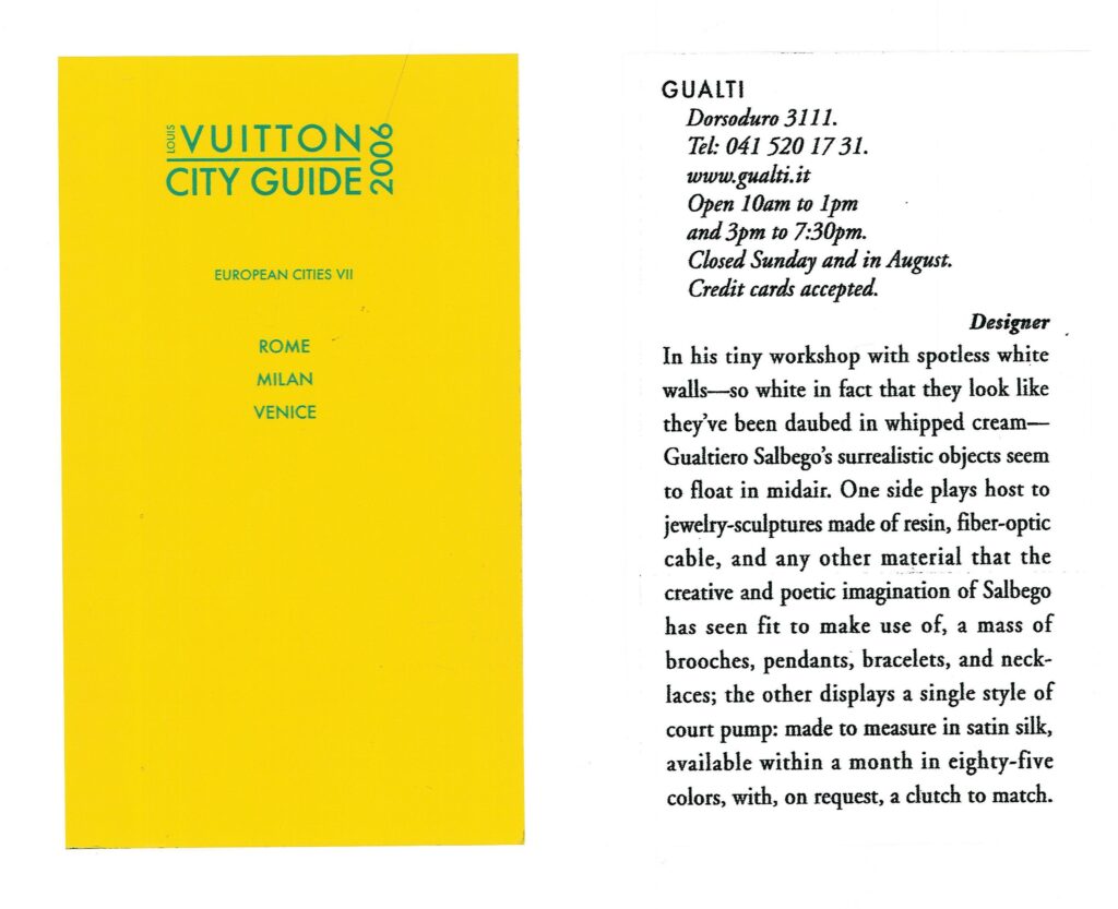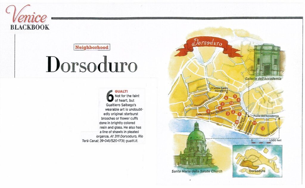 Venice BLACKBOOK Neighborhood Dorsoduro 6 GUALTI Not for the faint of heart, butGualtiero Salbego’s wearable art is undoubt- edly original: starburst brooches or flower cuffs done in brightly colored resin and glass. He also has a line of shawls in pleated organza. At 3111 Dorsoduro, Rio Terà Canal; 39-041/520-1731; qualti.it.