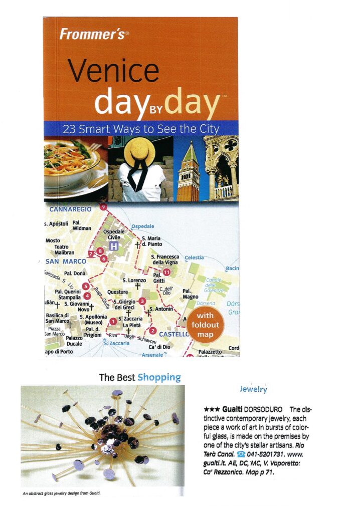 Gualti The distinctive contemporary jewelry, each piece a work of art in bursts of colorful glass, is made on the premises by one of the city’s stellar artisans.