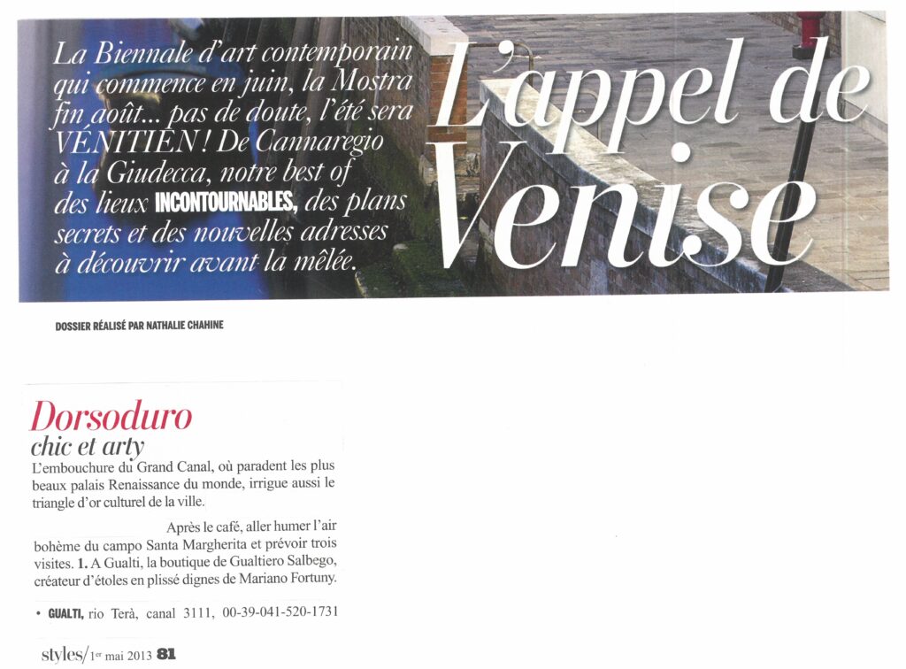 La Biennale d’art contemporain qui commence en juin, la Mostra fin août… pas de doute, l’été sera VENITIEN! De Cannaregio à la Giudecca, notre best of des lieux INCONTOURNABLES, des plans secrets et des nouvelles adresses à découvrir avant la mêlée. Lappel de Venise DOSSIER RÉALISÉ PAR NATHALIE CHAHINE Dorsoduro chic et arty L’embouchure du Grand Canal, où paradent les plus beaux palais Renaissance du monde, irrigue aussi le triangle d’or culturel de la ville. Après le café, aller humer l’air bohème du campo Santa Margherita et prévoir trois visites. 1. A Gualti, la boutique de Gualtiero Salbego, créateur d’étoles en plissé dignes de Mariano Fortuny. GUALTI, rio Terà, canal 3111, 00-39-041-520-1731