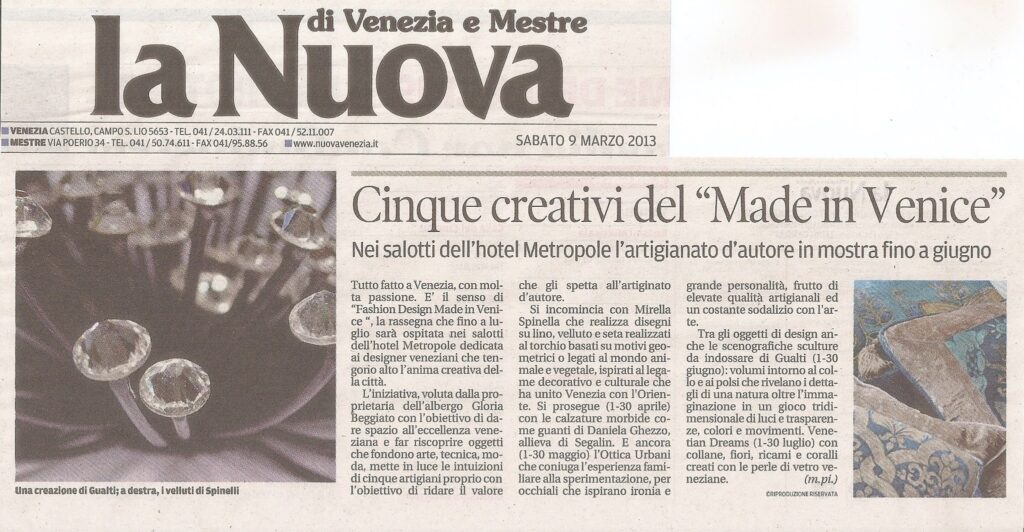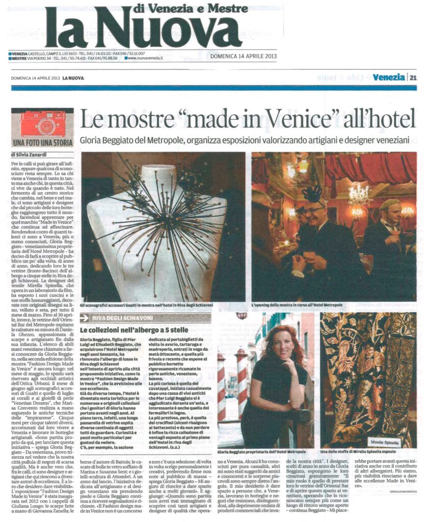 di Venezia e Mestre – Domenica 14 Aprile 2013 Le mostre “made in Venice” all’hotel Gloria Beggiato del Metropole, organizza esposizioni valorizzando artigiani e designer veneziani Per le calli si può girare all’infinito, eppure qualcosa di sconosciuto resta sempre. Lo sa chi viene a Venezia di tanto in tanto ma anche chi, in questa città, ci vive da quando è nato. Nel fermento di un centro storico che cambia, nel bene e nel male, ci sono artigiani e designer che dal piccolo delle loro botteghe raggiungono tutto il mondo, facendosi apprezzare per quel marchio “Made in Venice” che continua ad affascinare. Rendendosi conto di quanti talenti ci sono a Venezia, più o meno conosciuti, Gloria Beggiato-venezianissima proprietaria dell’Hotel Metropole – ha deciso di farli a scoprire al pubblico un po’ alla volta, di anno di anno, dedicando loro le tre vetrine (fronte-Bacino) dell’albergo a cinque stelle in Riva de- gli Schiavoni.