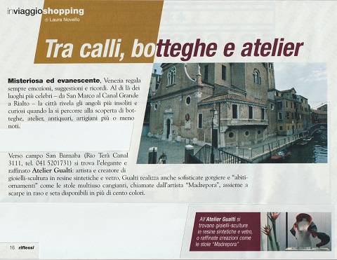 Verso campo San Barnaba (Rio Terà Canal 3111, tel. 041 5201731) si trova l’elegante e raffinato Atelier Gualti: artista e creatore di gioielli-scultura in resine sintetiche e vetro, Gualti realizza anche sofisticate gorgiere e “abiti- ornamenti” come le stole multiuso cangianti, chiamate dall’artista “Madrepora”, assieme a scarpe in raso e seta disponibili in più di cento colori.