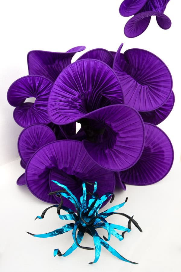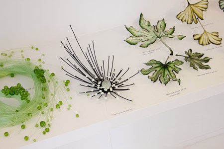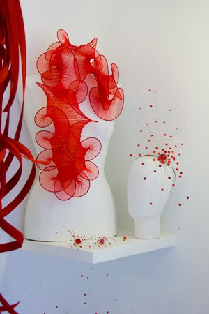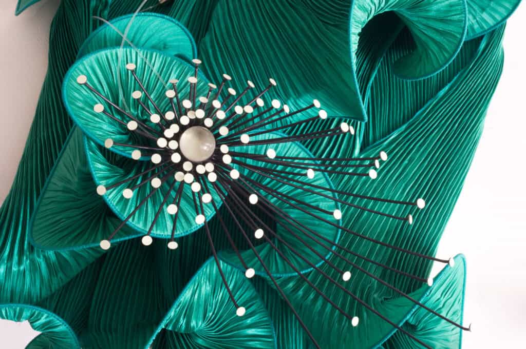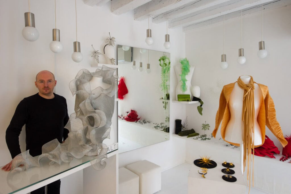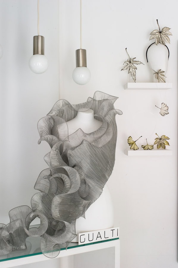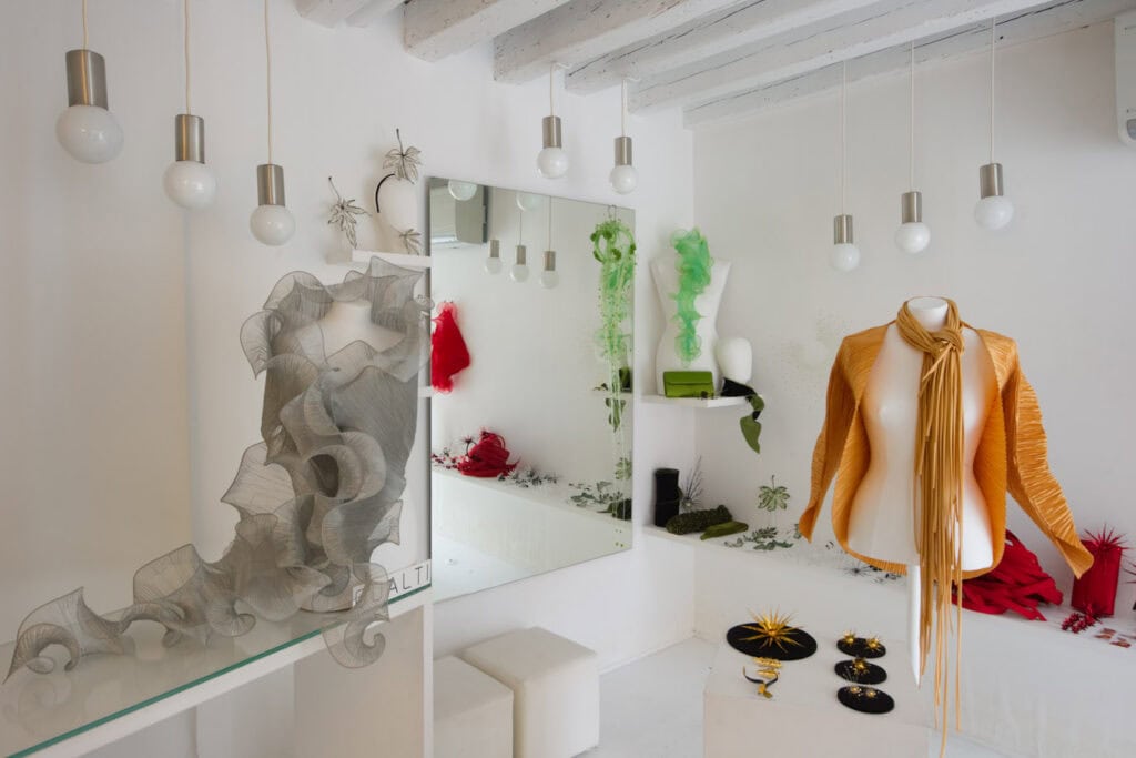 L’atelier, che si trova a Dorsoduro – Rio Terà Canal 3111, si presenta come uno spazio dal sapore surreale, bianco, candido, nel quale i “tessuti”, sembrano fluttuare, sospesi, e i preziosi, appoggiati su essenziali strutture, assomigliano a piccoli organismi tentacolari, ricordando che siamo nel cuore di Venezia, città d’acqua, città nell’acqua. E così una stola, confezionata con attenzione ai dettagli, propri dei prodotti dell’alta moda, prende sembianze di un corallo o di un alga, colorata, morbida, duttile, capace di cambiare con il movimento del corpo quasi fosse animata. I monili (anelli, bracciali, spille e ornamenti da mettere in testa), pensati come estensioni del corpo, sono contemporanei e nascono da un concetto di forma pura che “germoglia” in piccoli filamenti lucenti. Si ispira a foglie, anemoni, utilizzando materiali come vetro e resine.