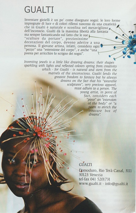 La morbidezza della seca, il profumo delle misture di resine sintetiche, le stimolazioni visive di nuovi percorsi creativi. E’ un’esperienza sensoriale quella che si vive nell’accostarsi alle crea- zioni di Gualtiero Salbego, in arte Gualti, un giovane artista che nel proprio atelier veneziano produce, sperimentando sulla materia, accessori (scarpe e borse in raso di seta disponibili su ordinazione tra 85 tonalità) e monili (vetro e resine).