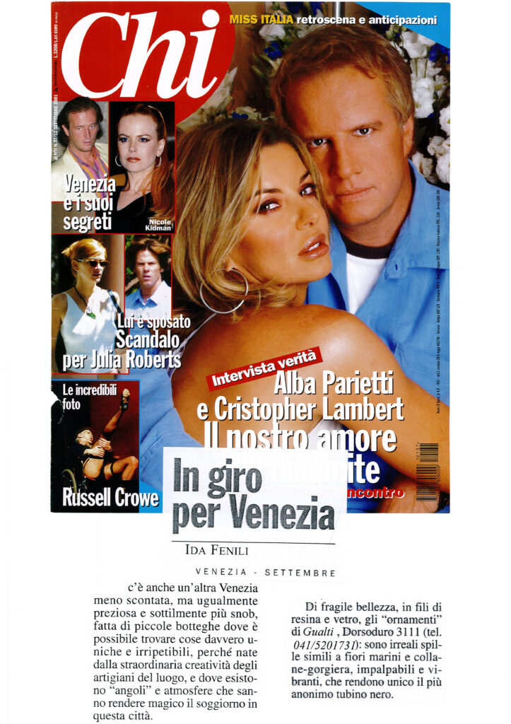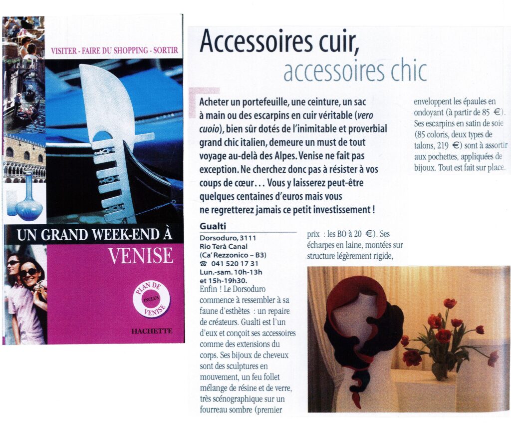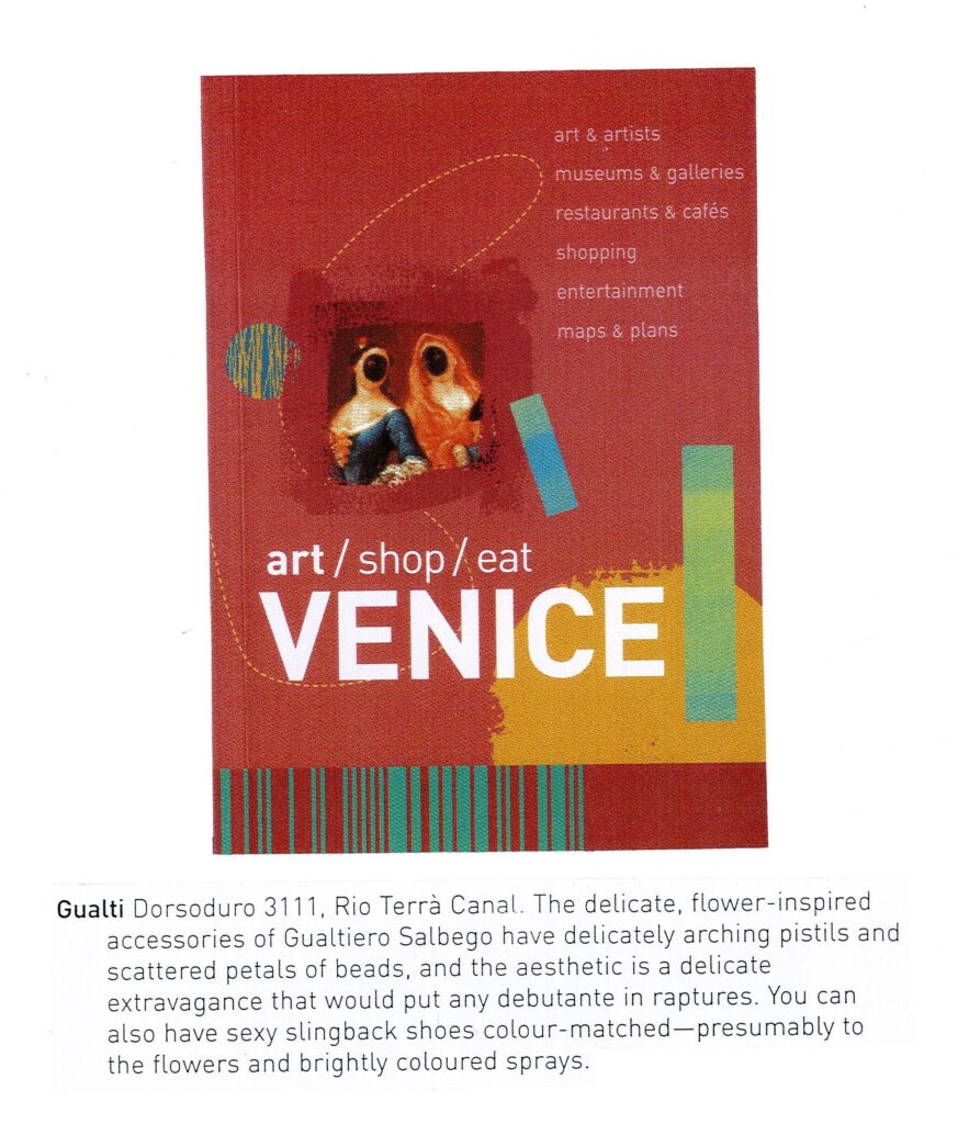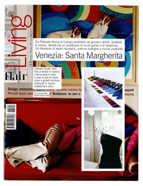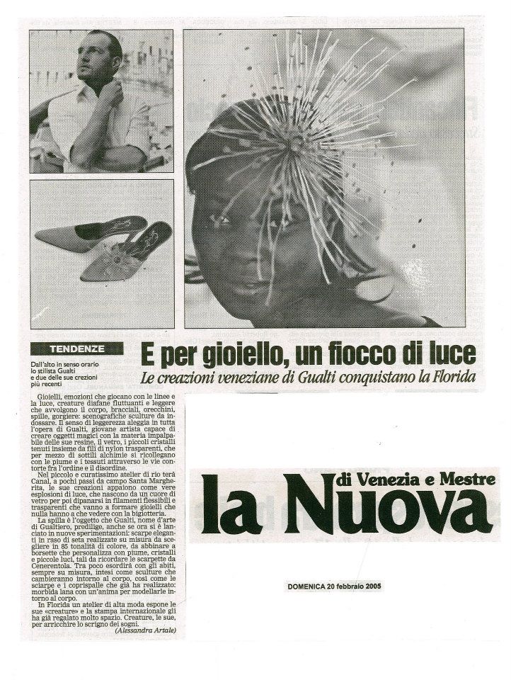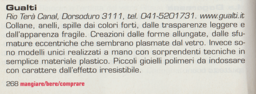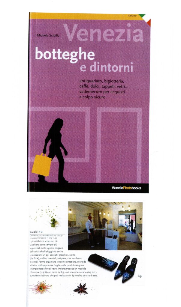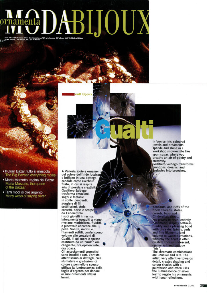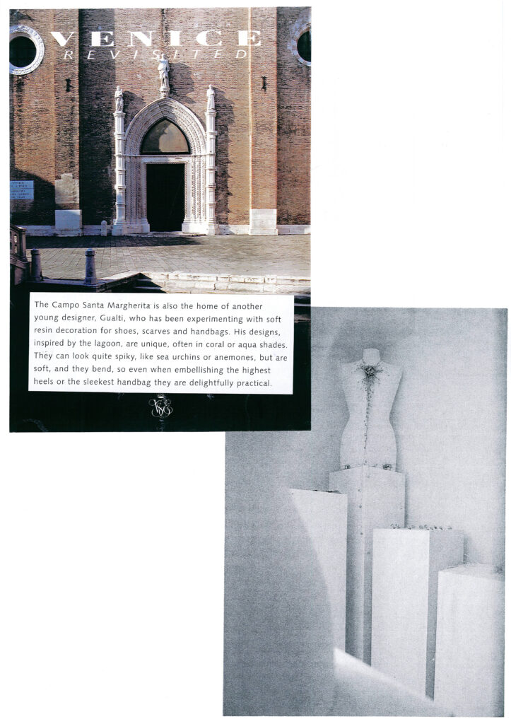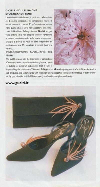 La morbidezza della seca, il profumo delle misture di resine sintetiche, le stimolazioni visive di nuovi percorsi creativi. E’ un’esperienza sensoriale quella che si vive nell’accostarsi alle crea- zioni di Gualtiero Salbego, in arte Gualti, un giovane artista che nel proprio atelier veneziano produce, sperimentando sulla materia, accessori (scarpe e borse in raso di seta disponibili su ordinazione tra 85 tonalità) e monili (vetro e resine).