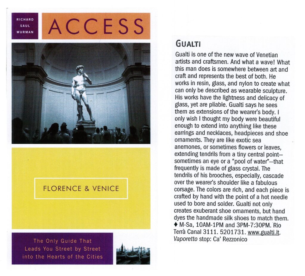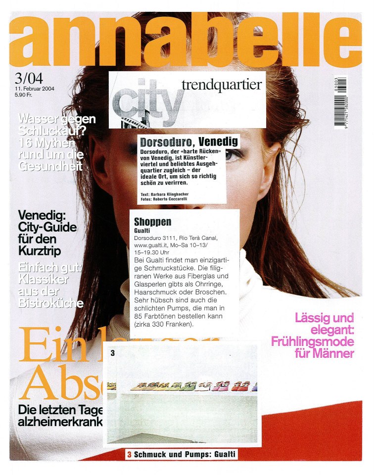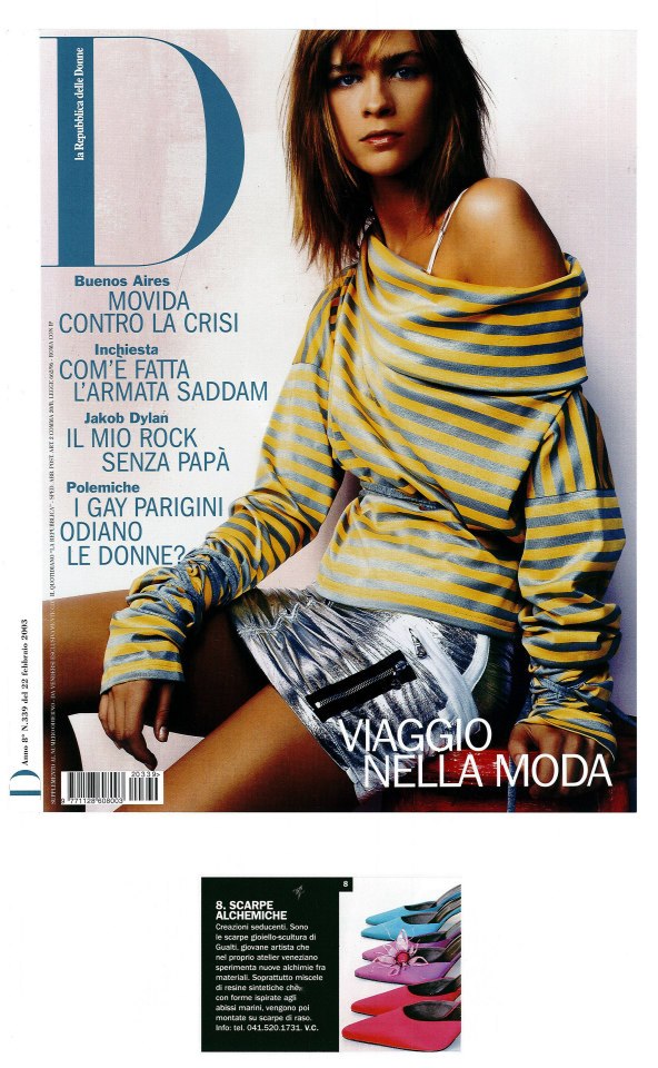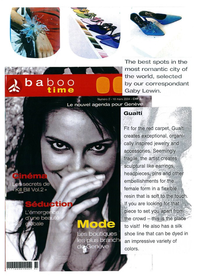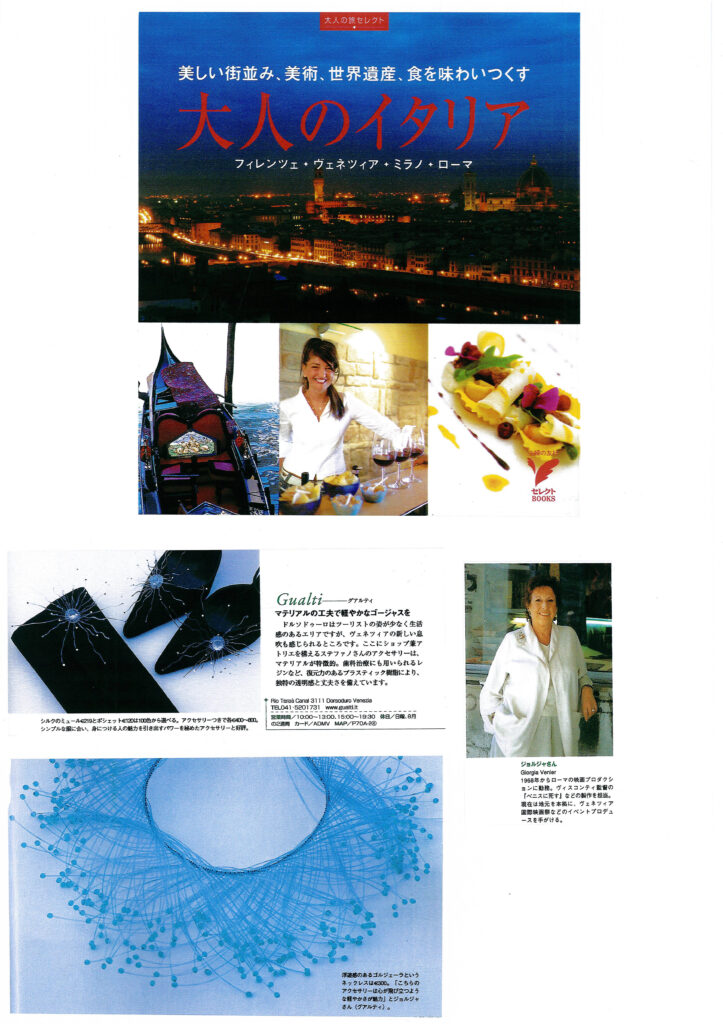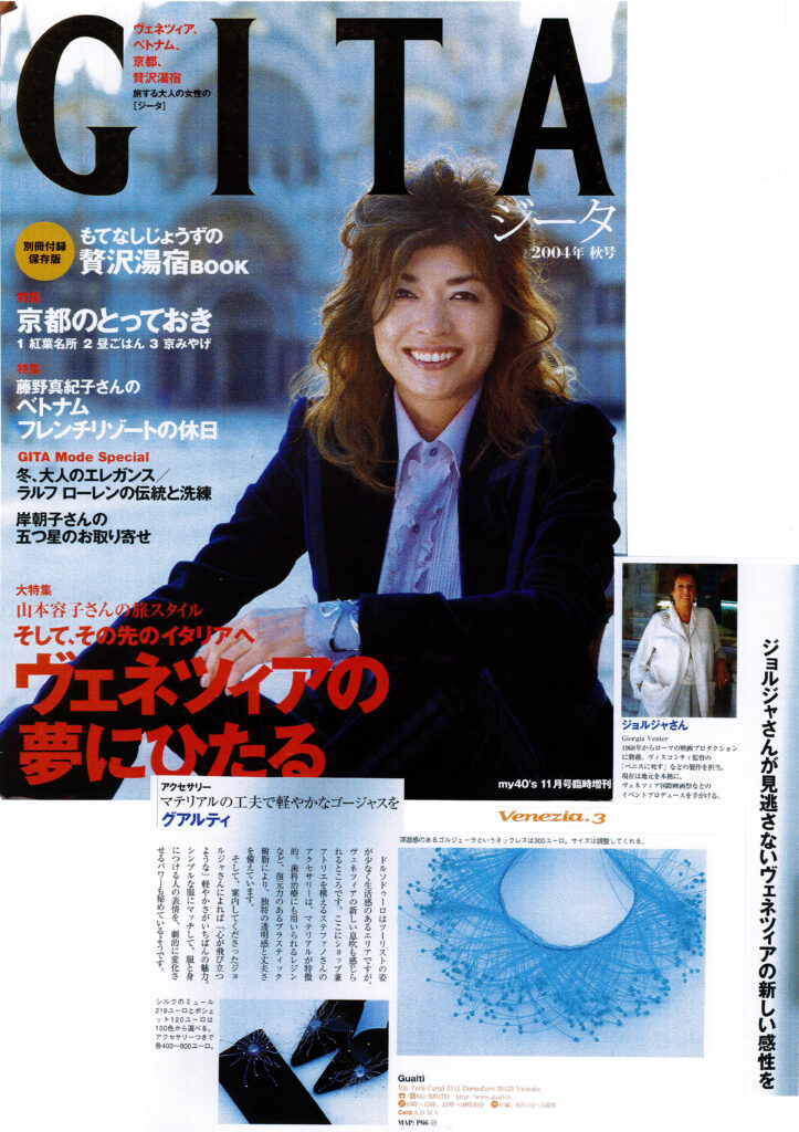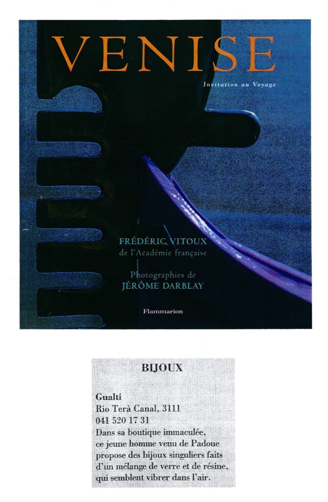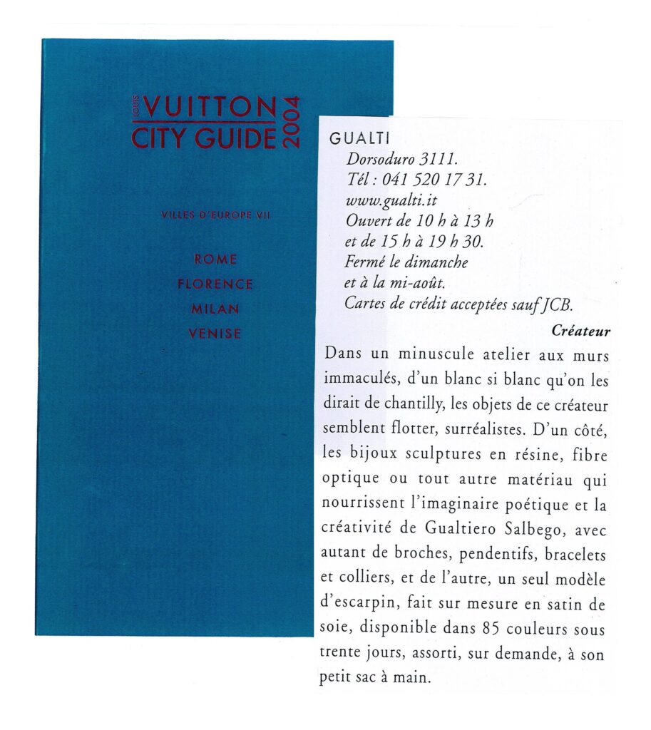 La morbidezza della seca, il profumo delle misture di resine sintetiche, le stimolazioni visive di nuovi percorsi creativi. E’ un’esperienza sensoriale quella che si vive nell’accostarsi alle crea- zioni di Gualtiero Salbego, in arte Gualti, un giovane artista che nel proprio atelier veneziano produce, sperimentando sulla materia, accessori (scarpe e borse in raso di seta disponibili su ordinazione tra 85 tonalità) e monili (vetro e resine).