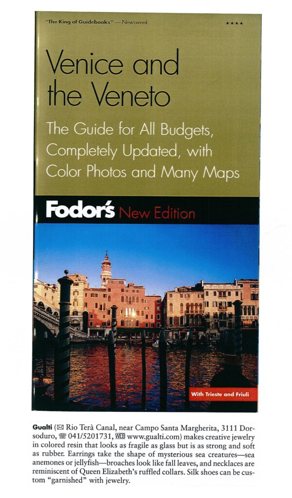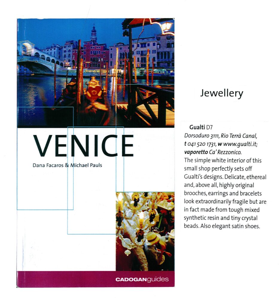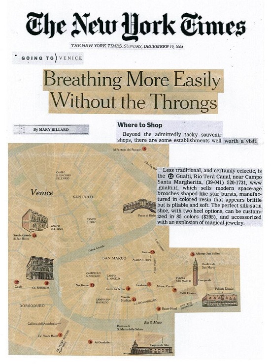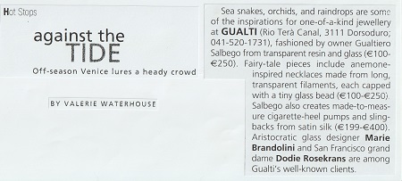 Sea snakes, orchids, and raindrops are some of the inspirations for one-of-a-kind jewellery at GUALTI (Rio Terà Canal, 3111 Dorsoduro; 041-520-1731), fashioned by owner Gualtiero Salbego from transparent resin and glass (€100- €250). Fairy-tale pieces include anemone inspired necklaces made from long, transparent filaments, each capped with a tiny glass bead (€100-€250). Salbego also creates made-to-meas- ure cigarette-heel pumps and slingbacks from satin silk (€199-€400). Aristocratic glass designer Marie Brandolini and San Francisco grand dame Dodie Rosekrans are among Gualti’s well-known clients.
