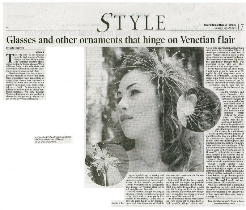 Gualti, a designer specializing in jewelry and body ornaments, describe what they produce as extensions of the body, offshoots of the wearer’s personality. Gualti’s work embodies all the lightness and delicacy of Venetian glass, yet is soft and pliable to the touch.