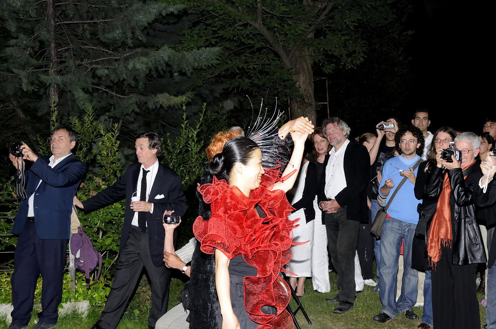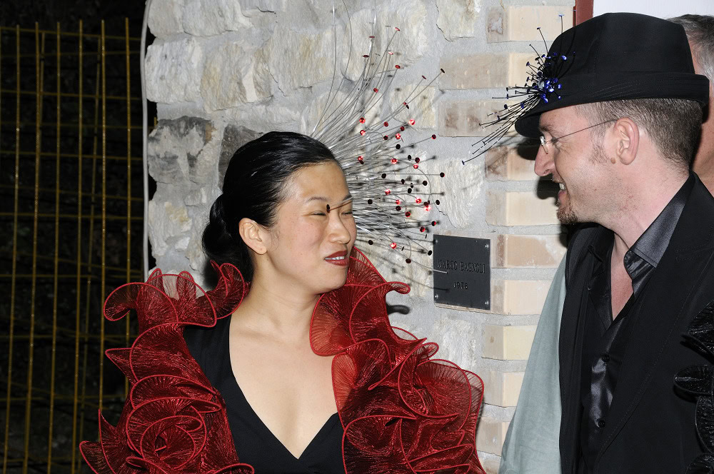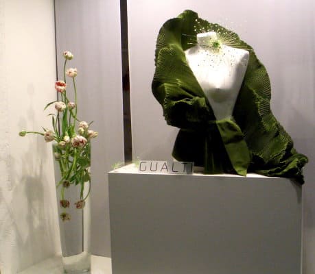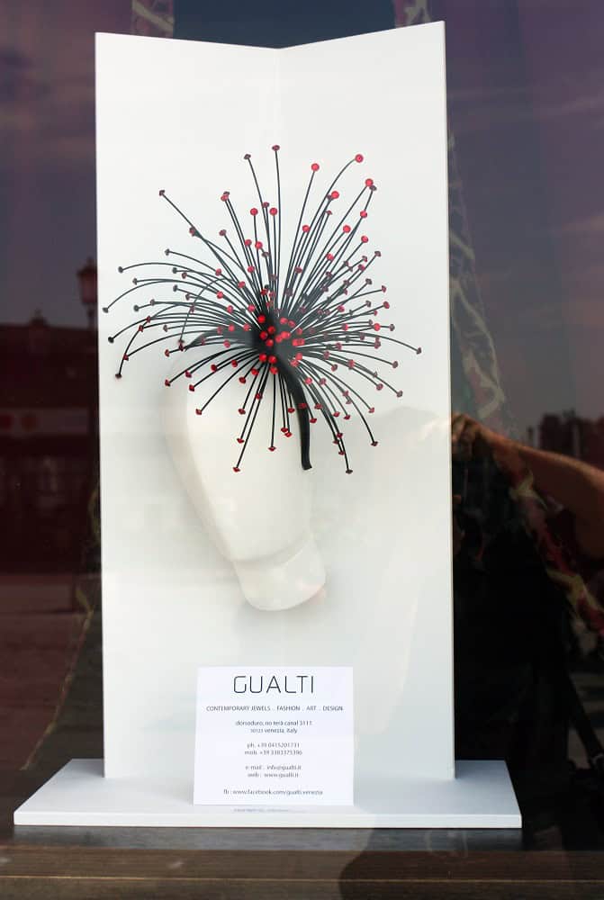 Let’s start this 2006 blog edition of Contessanally with this heavenly “firework display” of unusual sculpture-jewelry from Gualti’s tiny boutique/atelier just off the trendy Campo Santa Margherita. “My creations are unique, with fluid movements like an organic poem. The reflections and the vibrations of the resins mixed with a central piece of glass give light and a taste of eternity, where time vanishesโฆ..” Gualti explains. These bijoux evoke intense emotions and a brooch or an Elizabethan inspired ruffled collar/necklace will dress up any little black dress or jacket. They are extremely chic as the grand dames who wear them, like Dodi Rosekrans, who is famous for her masked balls in Palazzo Brandolini. In fact it is by “word of mouth” in a palazzo or a salotto that one discovers these divine surreal pieces. I suggest that if you are not bold or confident enough to wear one of these pieces, that you go and also look at the cloth wrap-around-wraps mounted on steel wires that recall the waves of the lagoon or the felt “octopus” inspired “scarves”. For sure, Peggy Guggenheim would have taken Gualti under her wing, bought out the whole collection and dedicated a show to this talented artist.