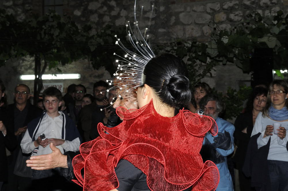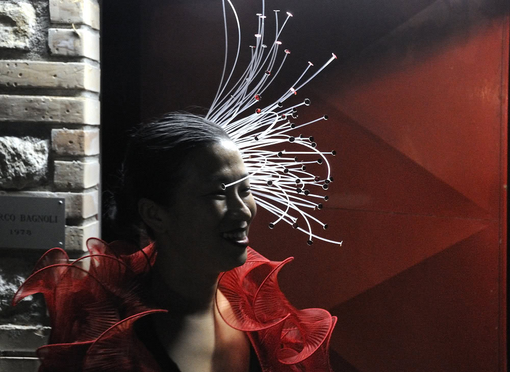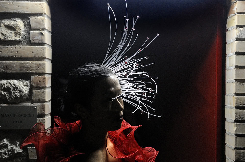 Enfin ! Le Dorsoduro commence ร ressembler ร sa faune d’esthรจtes un repaire de crรฉateurs. Gualti est l’un d’eux et conรงoit ses accessoires comme des extensions du corps. Ses bijoux de cheveux sont des sculptures en mouvement, un feu follet mรฉlange de rรฉsine et de verre, trรจs scรฉnographique sur un fourreau sombre (premier prix les BO ร 20 โฌ). Ses รฉcharpes en laine, montรฉes sur structure lรฉgรจrement rigide,