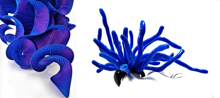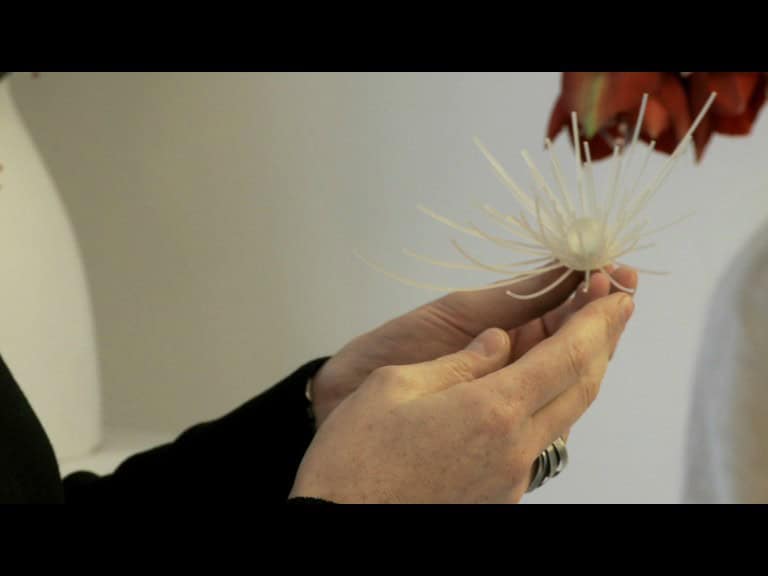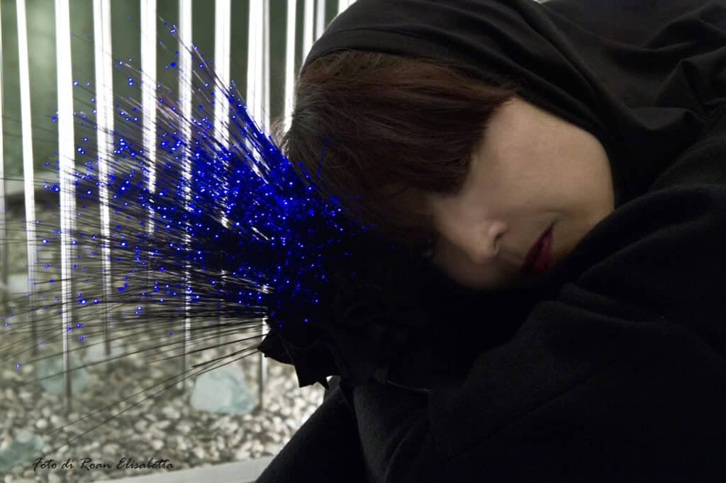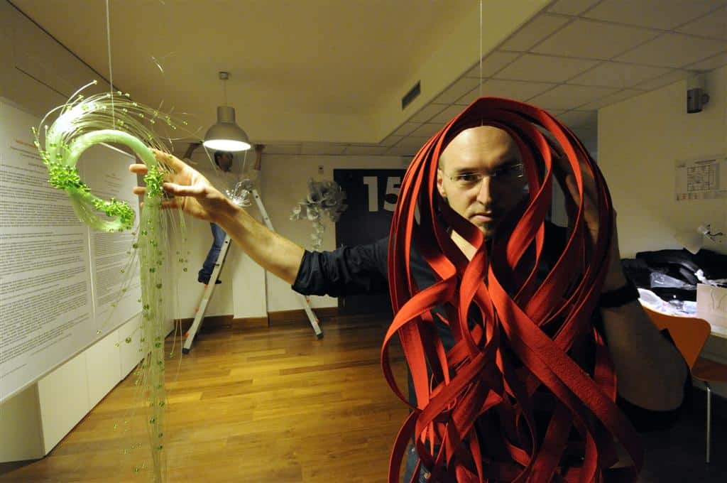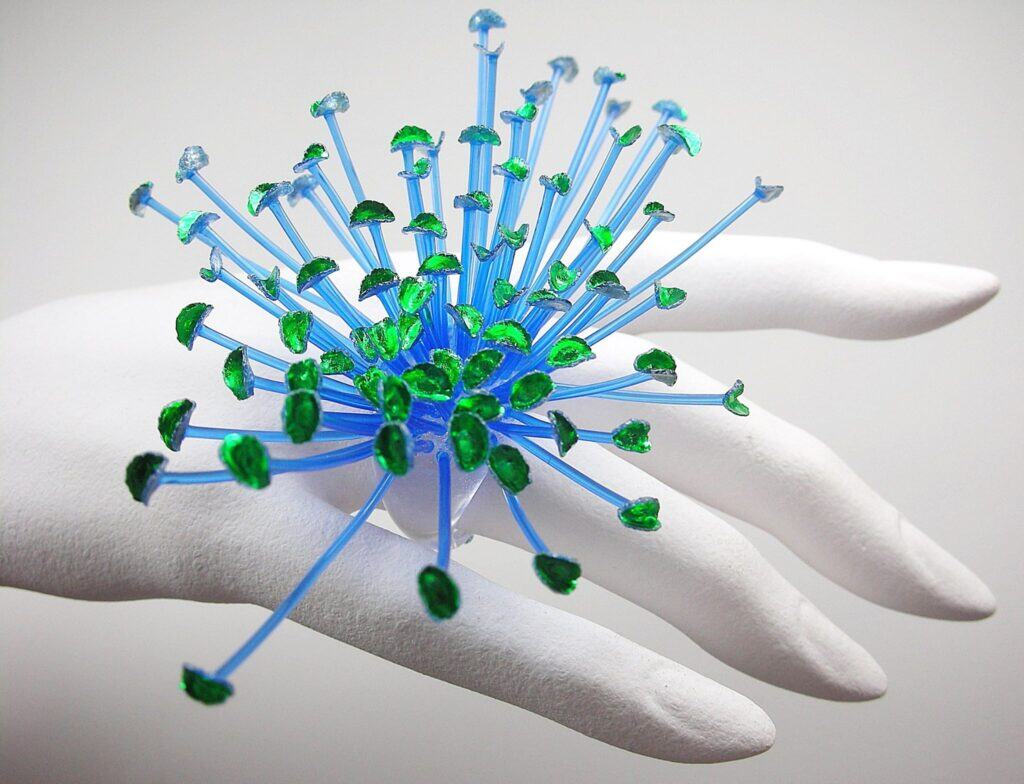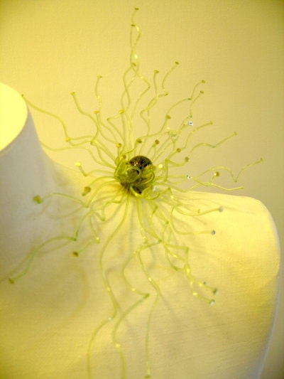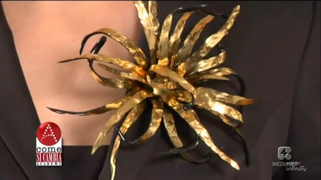 The unstable, curvy, iridescent and vibrant creations of one of these young artists accompany the numerous elegant Venetian and foreign clients along an imaginary path of stylistic perfection, which tends to move away from the object towards its symbolic value. Pins, chokers, bracelets and hat pieces are all born from his passion for nature and for everything that is hidden under the appearance of what is real (roots, shoots, stamen, filaments, pistils) and for this reason they are created using a synthetic resin, soft and delicate and very fragile in appearance.