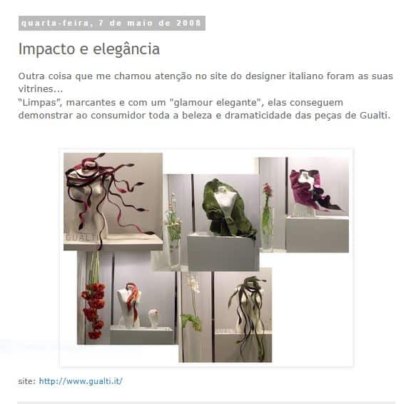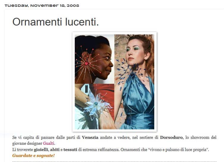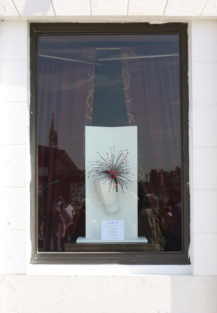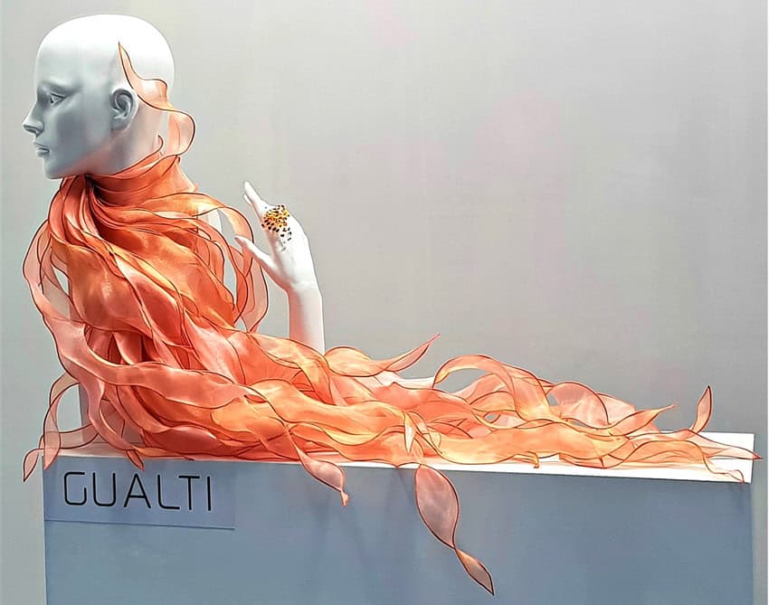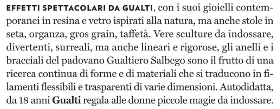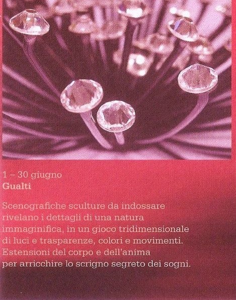 English text: ” ELEGANCE AND DESIGN, STRENGHT AND LIGHTNESS IN GUALTI’S JEWELS “Una wunderkammer nel cuore di Venezia, a Santa Margherita, uno spazio emozionale bianco dove lโocchio vaga tra armonie di colori con la sensazione che le creazioni in mostra siano talmente leggere da fluttuare nellโaria. ร il mondo di Gualti.