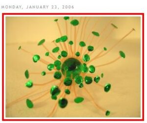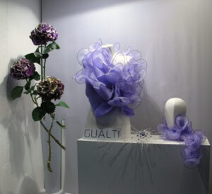 filamenti sottili, conferiscono volume alle creazioni di Gualti, il cui cuore è spesso costituito da un’”iride” cangiante, ora opalescente, ora opaca.