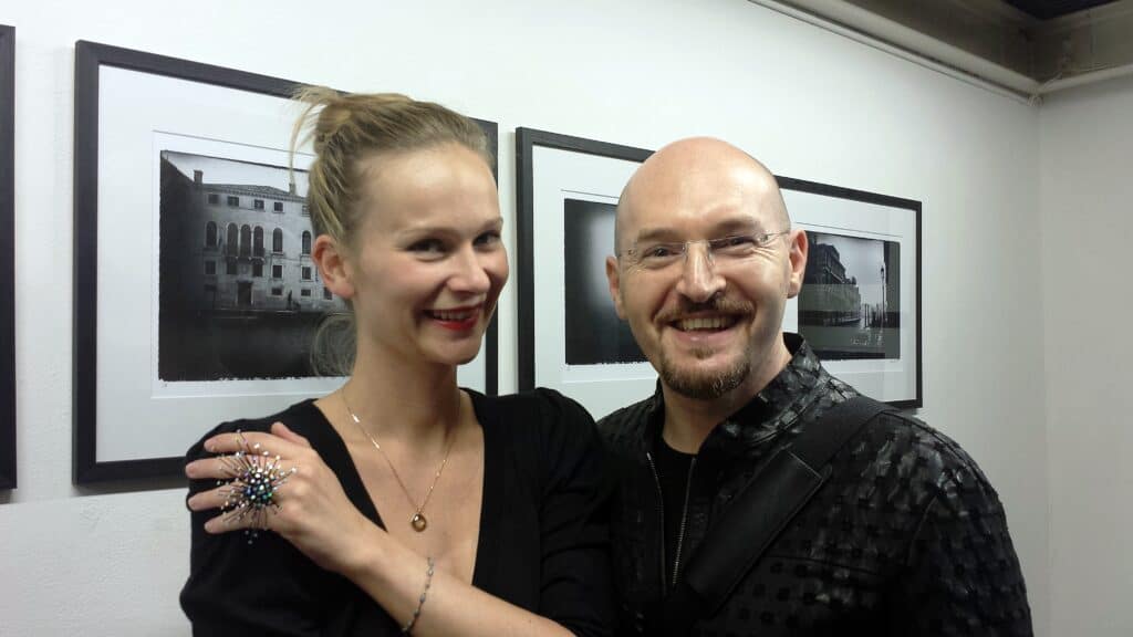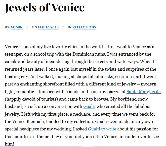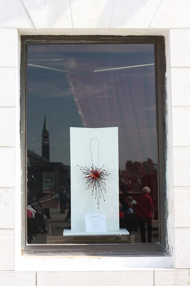 English text: ” ART IN VENICE : GUALTI AND HIS JEWELS “Arte a Venezia: Gualti e le sue creazioni