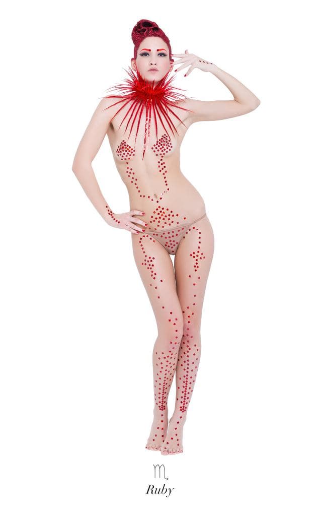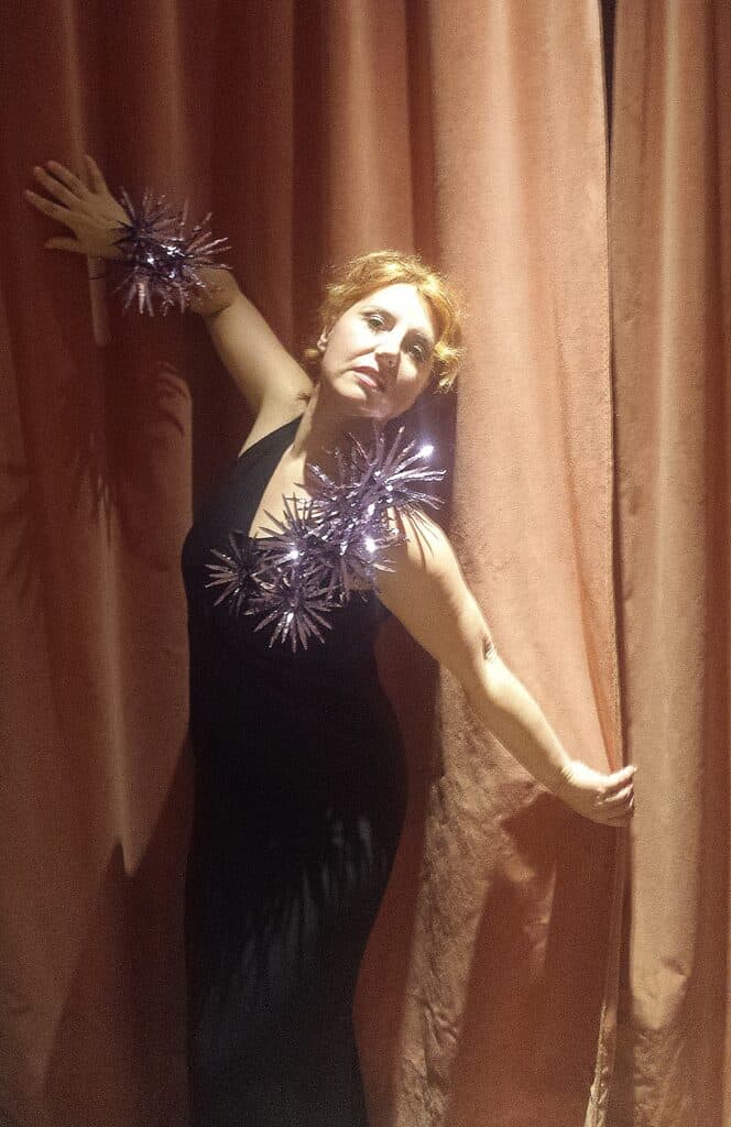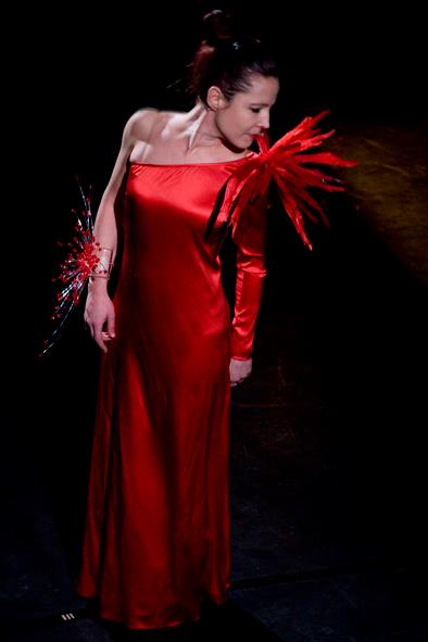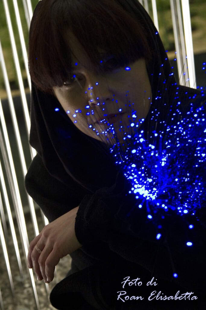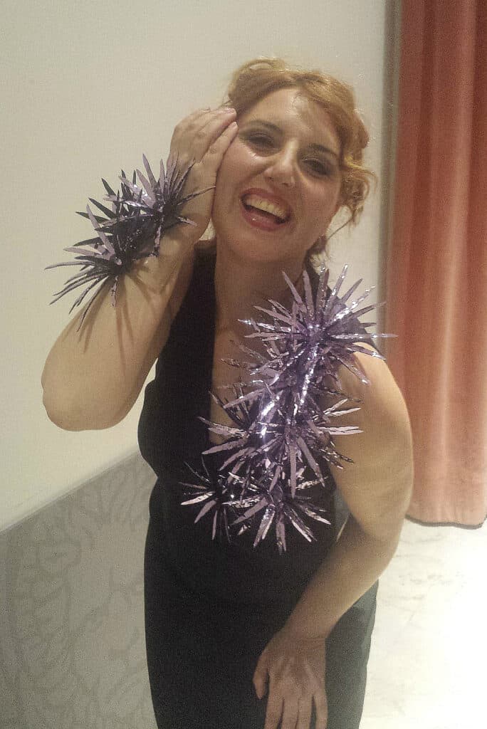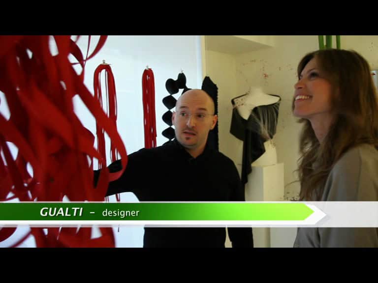 di gioielli-scultura in resine sintetiche e vetro, Gualti realizza anche sofisticate gorgiere e “abiti- ornamenti” come le stole multiuso cangianti, chiamate dall’artista “Madrepora”, assieme a scarpe in raso e seta disponibili in piรน di cento colori.