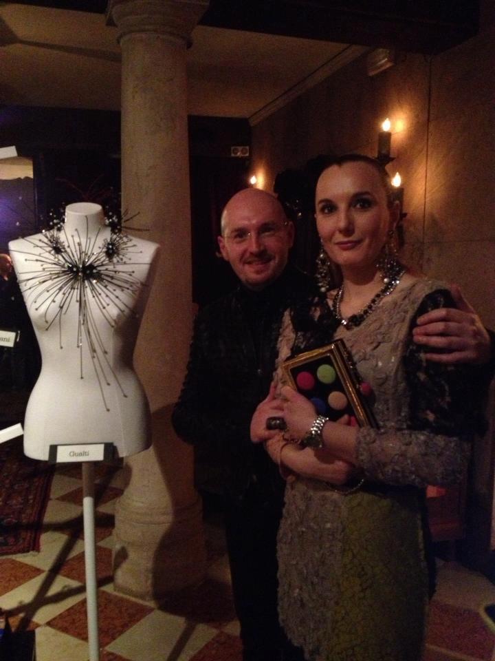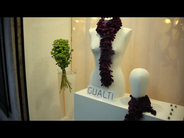 Le creazioni veneziane di Gualti conquistano la FloridaGioielli, emozioni che giocano con le linee e la luce, creature diafane fluttuanti e leggere che avvolgono il corpo, bracciali, orecchini, spille, gorgiere: scenografiche sculture da indossare. Il senso di leggerezza aleggia in tutta l’opera di Gualti, giovane artista capace di creare oggetti magici con la materia impalpabile delle sue resine, il vetro, i piccoli cristalli tenuti insieme da fili di nylon trasparenti, che per mezzo di sottili alchimie si ricollegano con le piume e i tessuti attraverso le vie contorte fra l’ordine e il disordine..