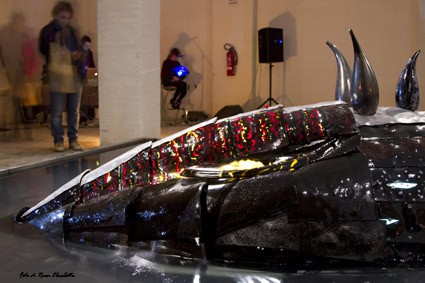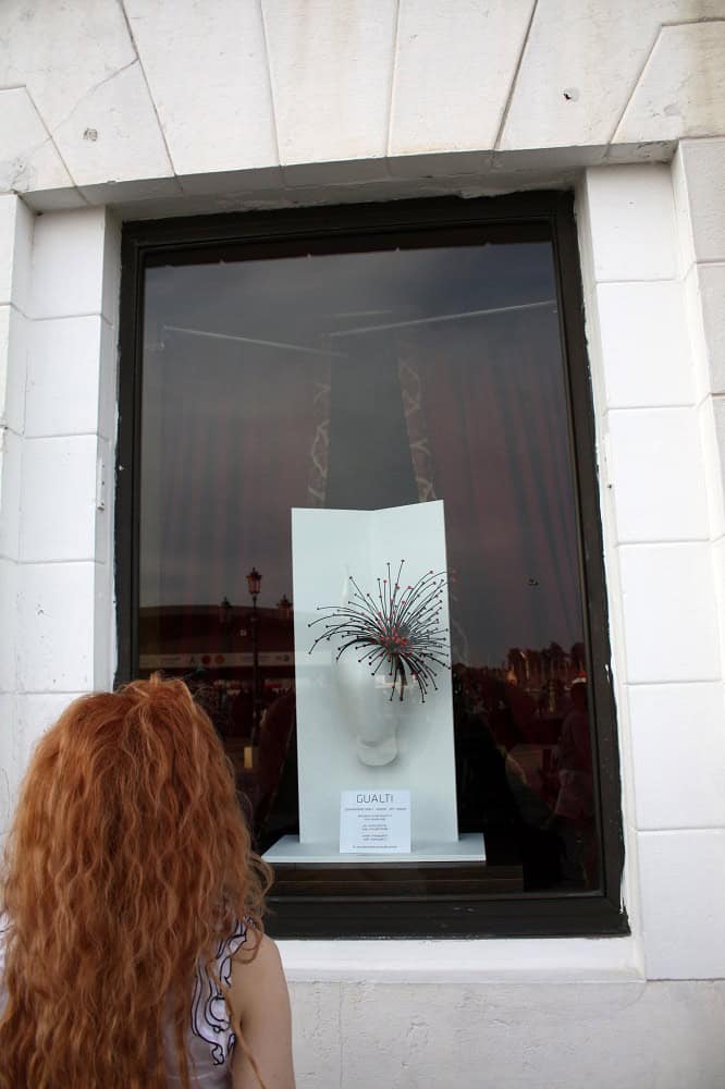 Gualti is one of the new wave of Venetian artists and craftsmen. And what a wave! What this man does is somewhere between art and craft and represents the best of both. He works in resin, glass, and nylon to create what can only be described as wearable sculpture. His works have the lightness and delicacy of glass, yet are pliable. Gualti says he sees them as extensions of the wearer’s body. I only wish I thought my body were beautiful enough to extend into anything like these earrings and necklaces, headpieces and shoe ornaments. They are like exotic sea