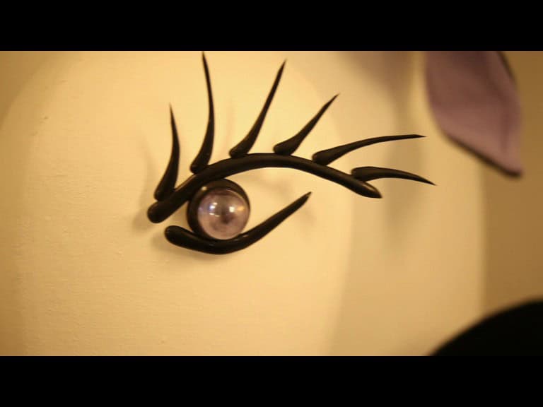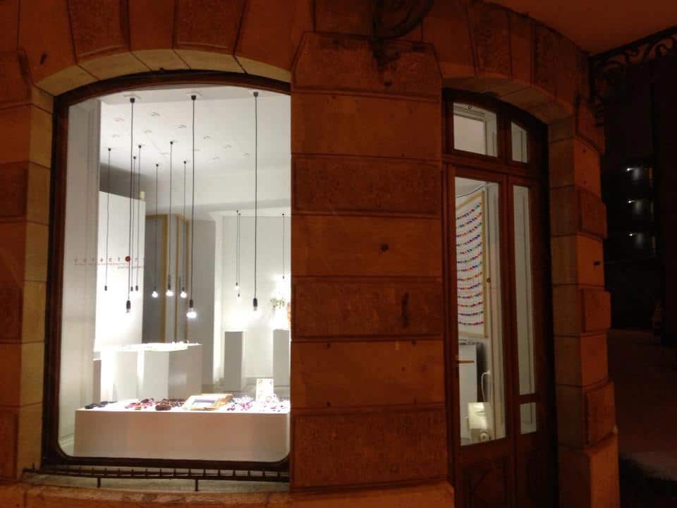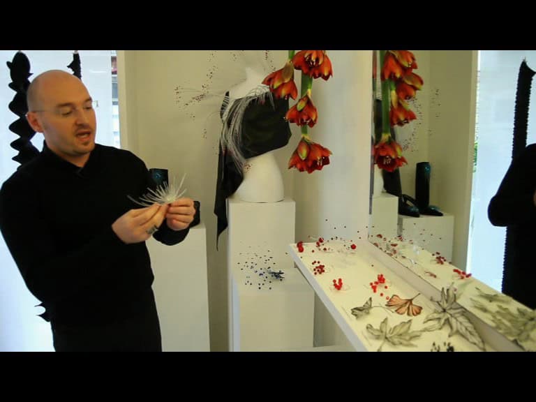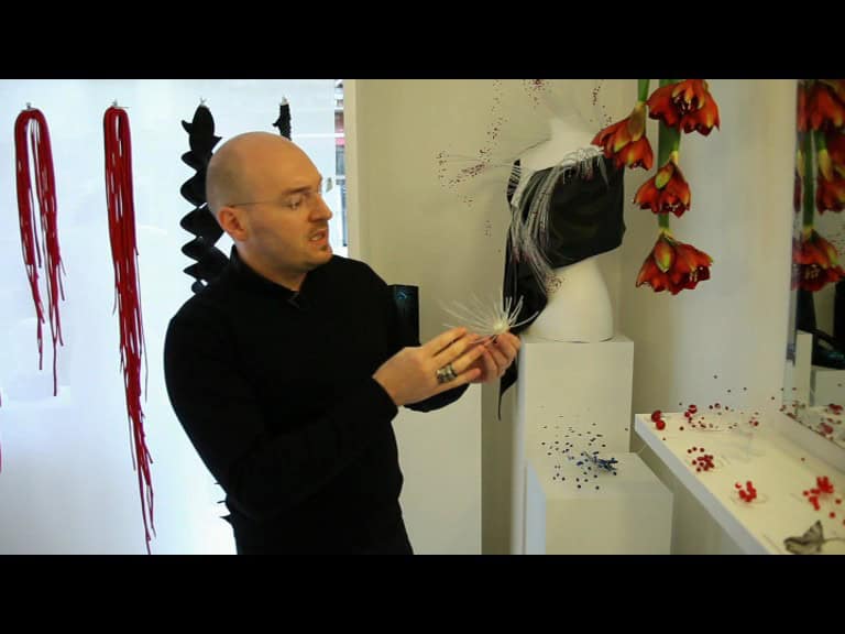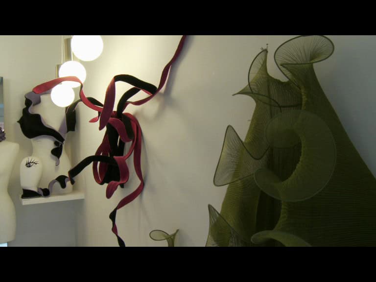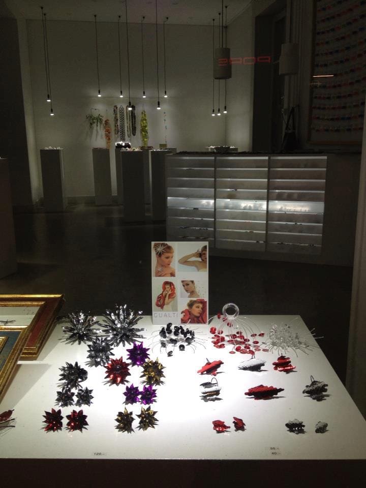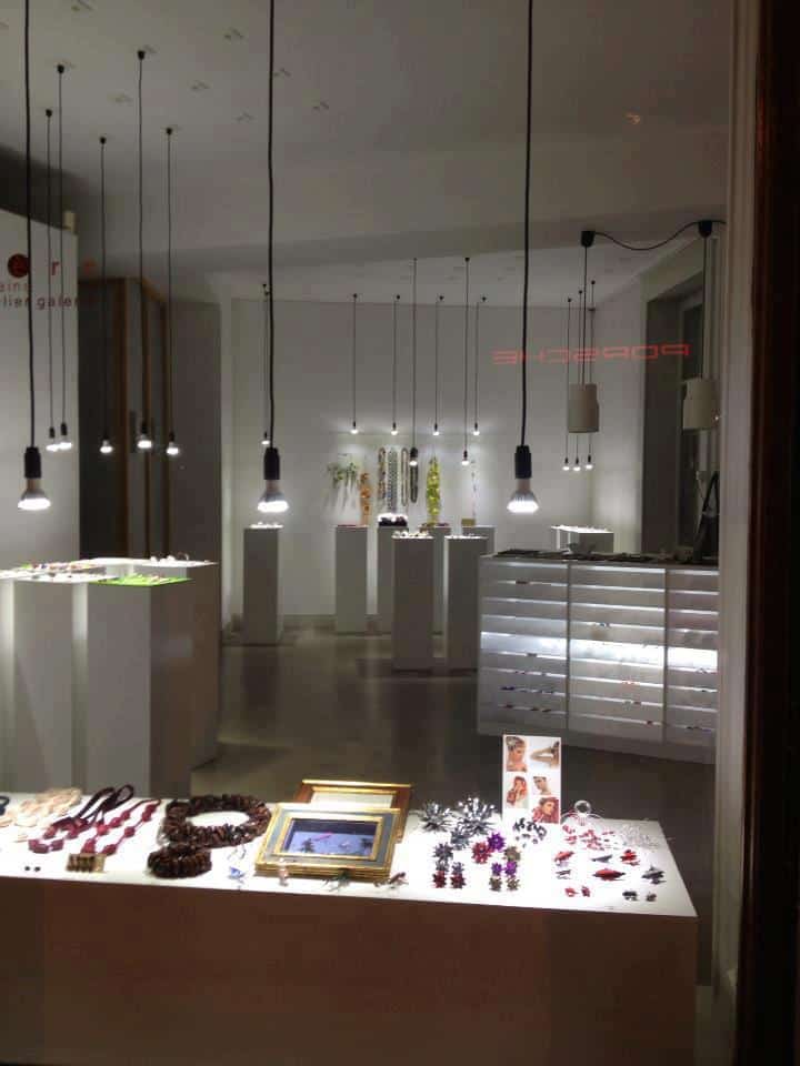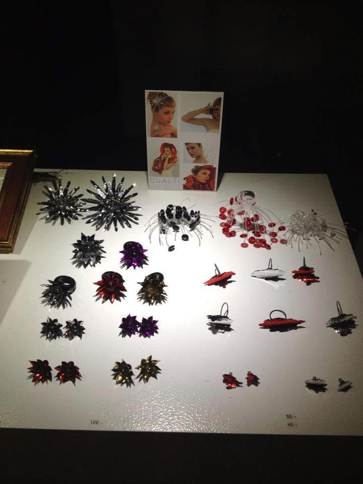 oddity houses two quite unrelated collections. On the one hand there’s a set of daring ladies’ satin shoes in a range of colours. On the other there are strangely luminous brooches, pins and similar accessories that look like something in between a burst of fireworks and those 1970s table lamps that resemble clumps of unkempt hair with luminous split ends. Intriguing.