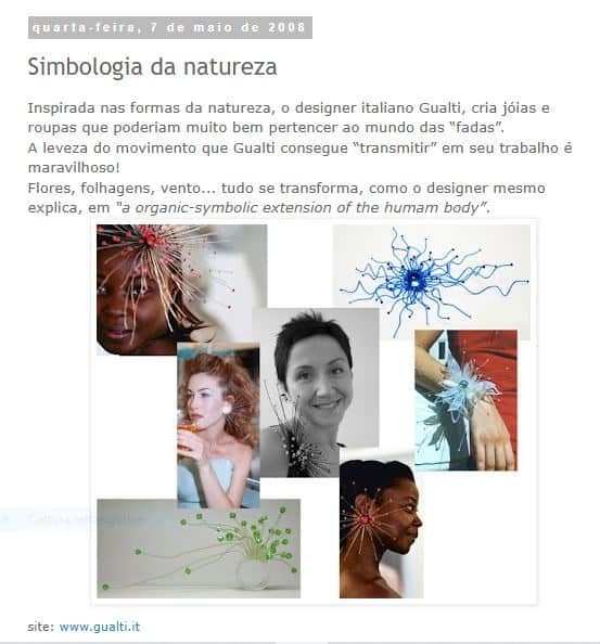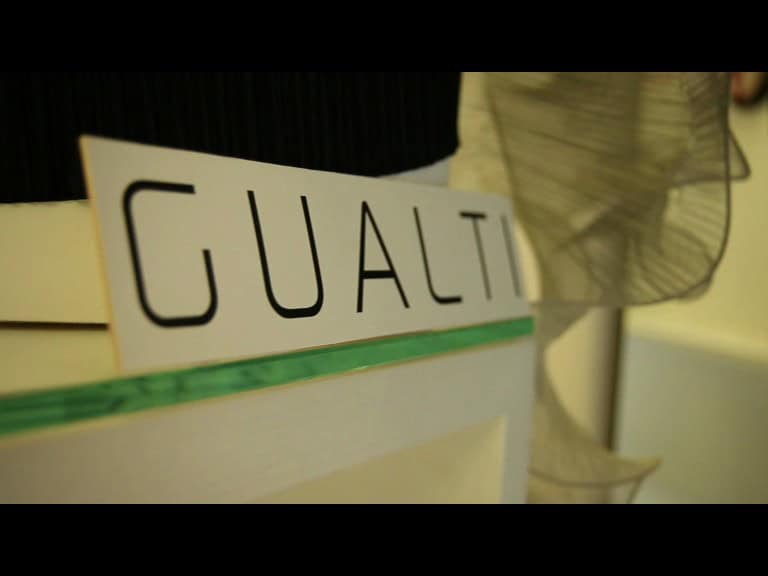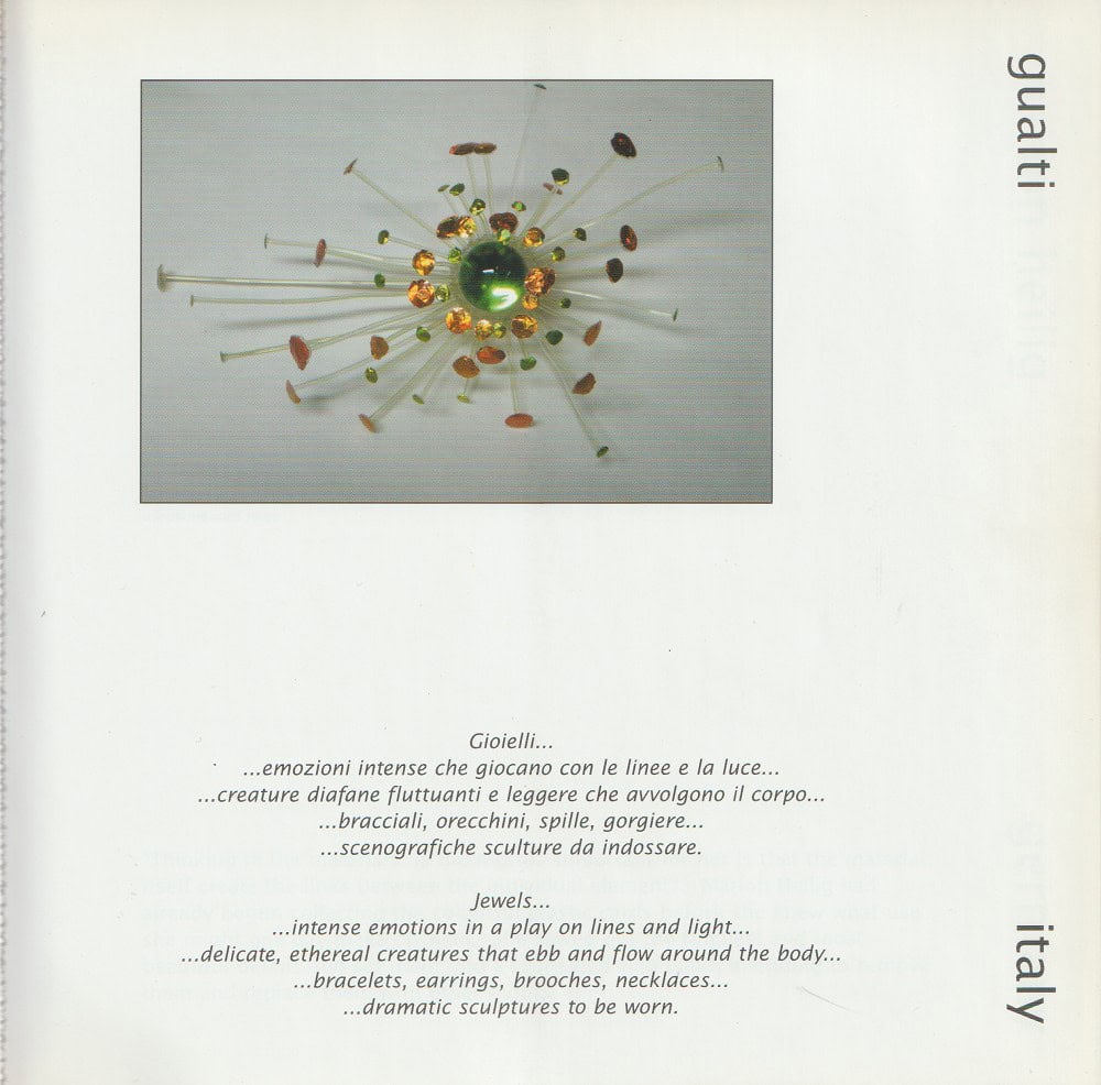 Inventare gioielli รจ un po’ come disegnare sogni: le loro forme impregnate di luce e di colori riflessi nascono da una creativitร che in Gualti รจ naturale e sconfina nel meraviglioso, dell’inconscio. Gualti dร la massima libertร alla fantasia ma sempre fantasticando sul fatto che le sue p “sculture da portare”, preziosissime decorazioni del corpo, devono aderire a una, persona. Il giovane artista, infatti, considera ogni “pezzo” una “estensione del corpo”, e anche “una poesia per arricchire lo scrigno dei sogni”.