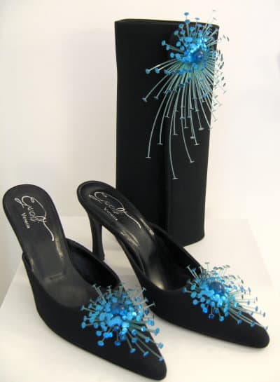 anemones, or sometimes flowers or leaves, extending tendrils from a tiny central point- sometimes an eye or a “pool of water”-that frequently is made of glass crystal. The tendrils of his brooches, especially, cascade over the wearer’s shoulder like a fabulous corsage. The colors are rich, and each piece is crafted by hand with the point of a hot needle used to bore and solder. Gualti not only creates exuberant shoe ornaments, but hand dyes the handmade silk shoes to match them.