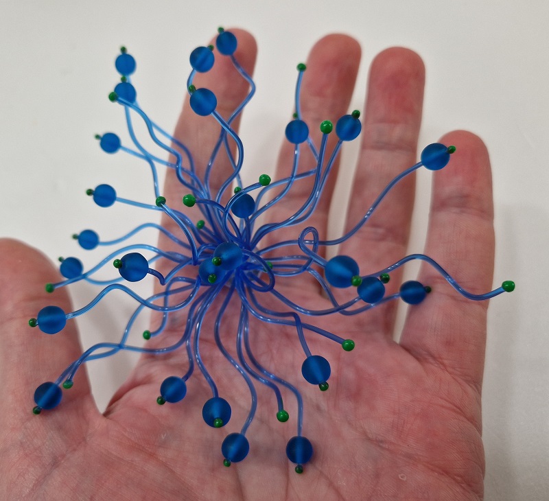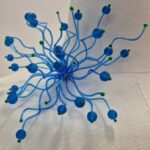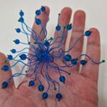 Materials : acrylic half sphere Ø 14 mm, glossy blue nylon monofilament Ø 1,20 mm, cobalt blue frosted round glass beads Ø 6 mm, glossy green varnish, silver metal pin back with locking clasp made of nickel-pleated copper